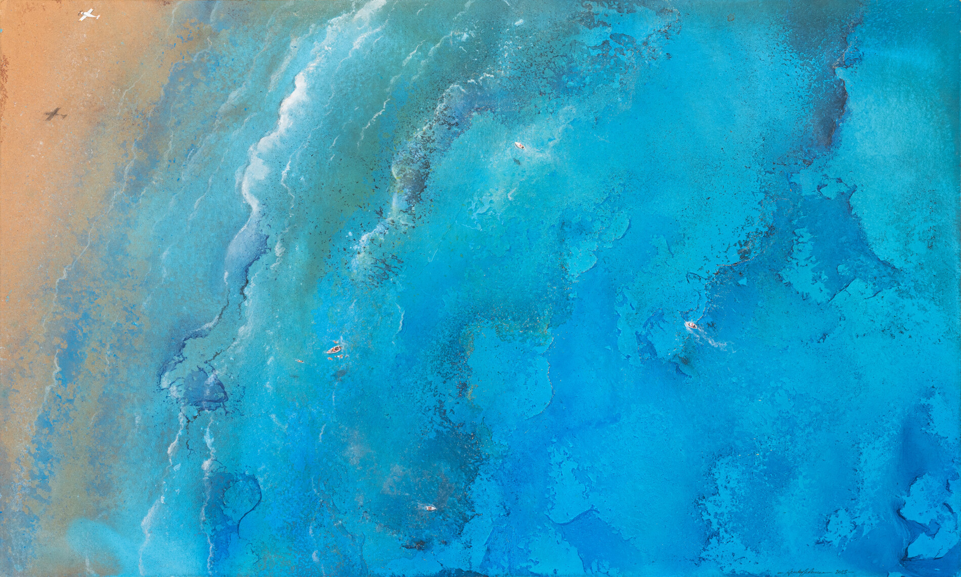 Una distesa sabbiosa invita l’osservatore ad un primo sguardo, prima che l’occhio scivoli verso il blu profondo del mare. Il passaggio tra i due elementi è naturale, ampio, e costruisce un movimento lento che guida lo sguardo senza interruzioni. L’ombra dell’aereo sulla sabbia aggiunge un dettaglio inatteso, un istante catturato dall’alto che dà ritmo e narrazione alla composizione. Le velature e la stratificazione pittorica permettono all’opera di cambiare tono con la luce, rivelando sfumature che emergono e scompaiono nel corso della giornata.