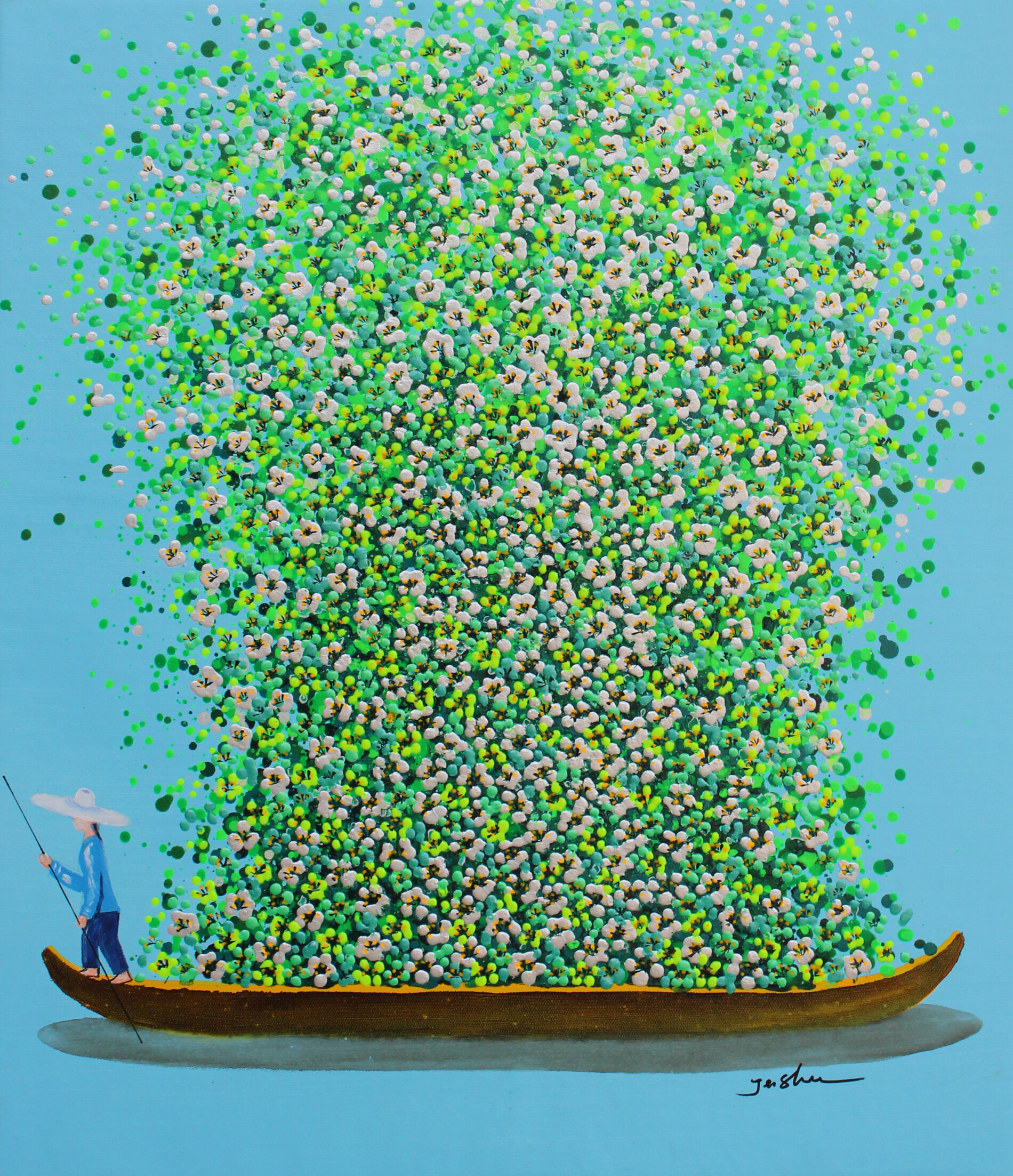 La barca, soggetto tra i più iconici della ricerca di Je Shen, diventa il punto di partenza di una fioritura vibrante e luminosa che si espande verso l’alto come un’esplosione di energia vitale. L’artista cinese trasforma la scena in una metafora di equilibrio e viaggio interiore, dove essenzialità formale e intensità emotiva convivono con grande naturalezza.
