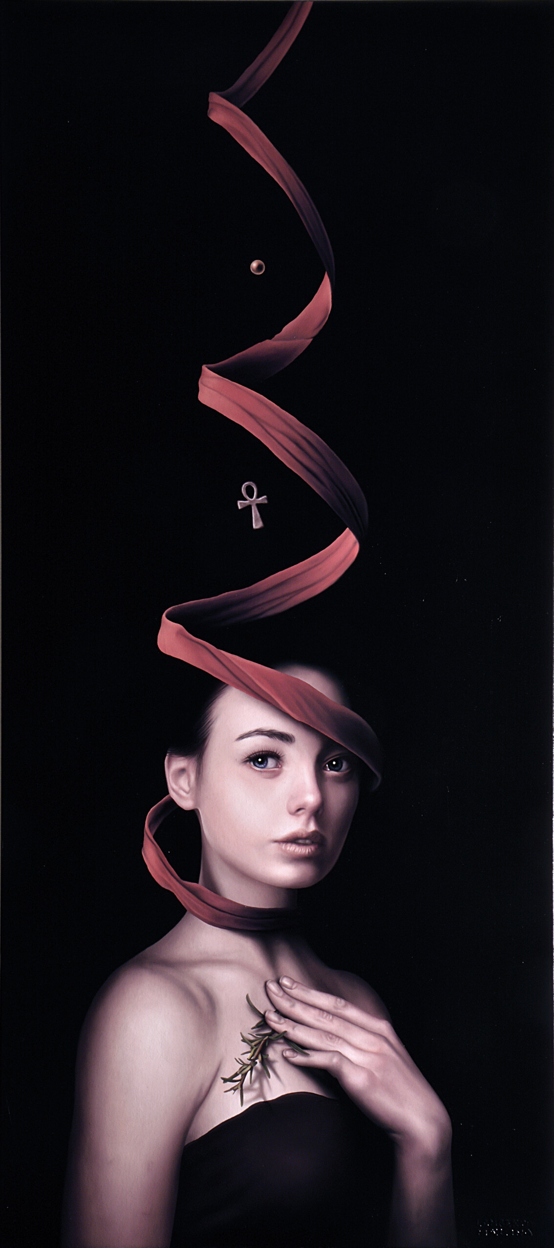 La protagonista, ritratta con iperrealismo puro e vellutato, è al centro di questo flusso. Lo sguardo, diretto e sorprendentemente presente, crea un legame immediato con chi osserva. E sul petto, la piccola ramificazione verde simboleggia la forza della rinascita interiore. La verticalità della composizione amplifica l’effetto: il movimento del nastro sembra continuare oltre la cornice, mentre la quiete della figura trattiene il tempo in un respiro sospeso.