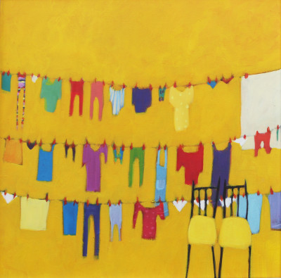 Nell’arte di Beth Richardson, gli oggetti del quotidiano diventano spunto per riflessioni più profonde; in quest’opera, sui toni dell’azzurro e del rosa, una sedia sospesa tra rami in fiore si apre a una dimensione leggera e contemplativa, lasciando allo spettatore una libera interpretazione.