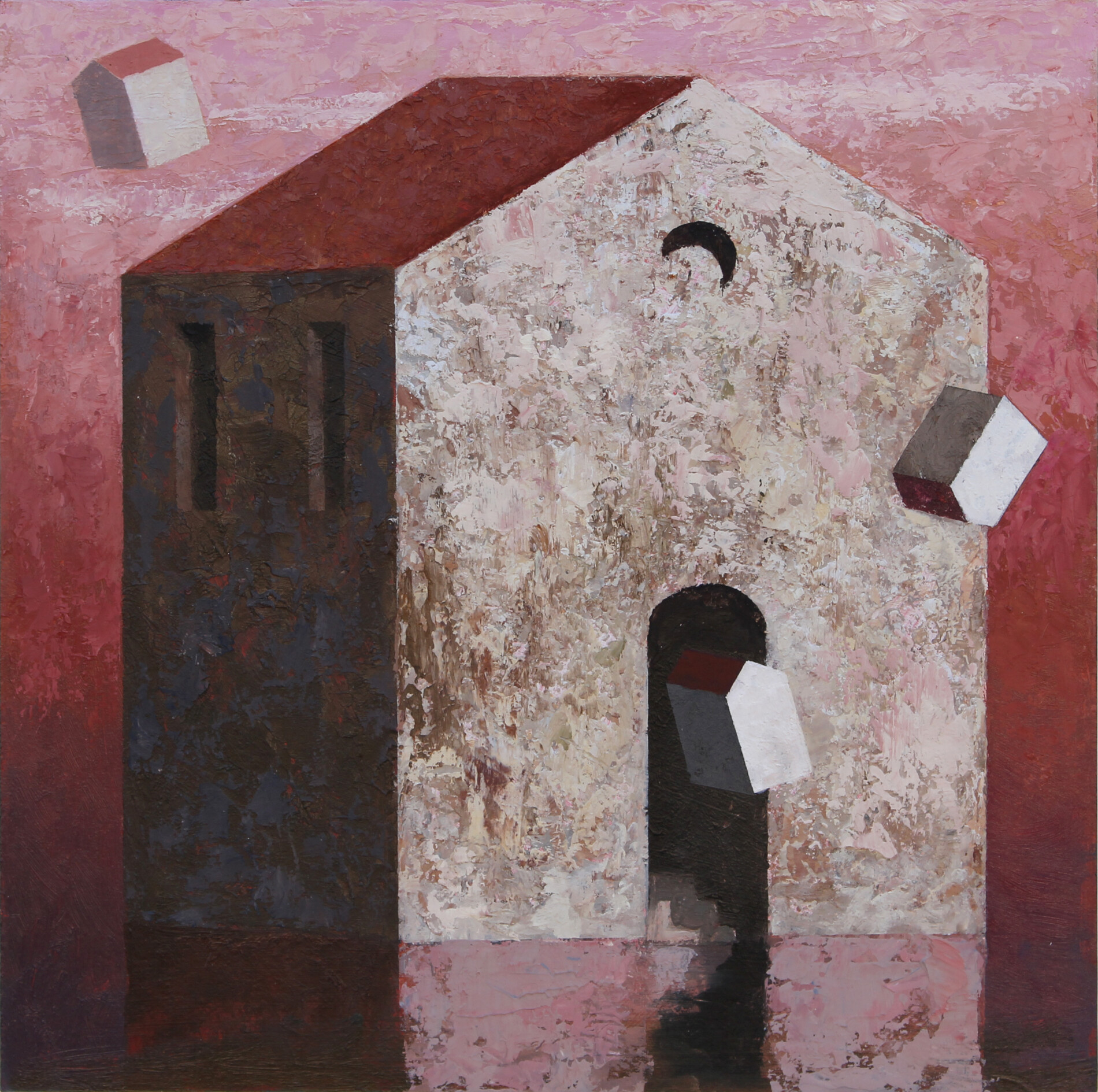 Un'abitazione si staglia su un paesaggio rosato, le sue pareti materiche attraversate da spatolate dense che rivelano la tipica ricerca pittorica di Matthias Brandes. La luce scivola sulle superfici, scolpendo le forme e restituendo all’architettura un carattere quasi scultoreo.