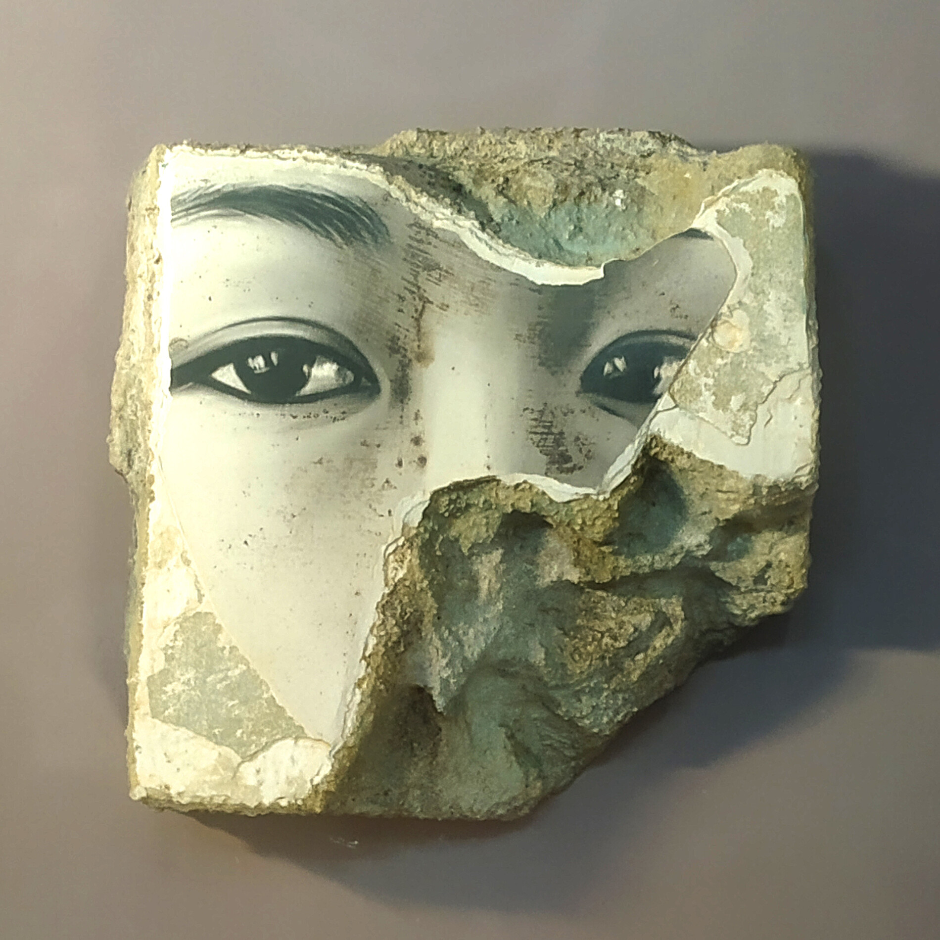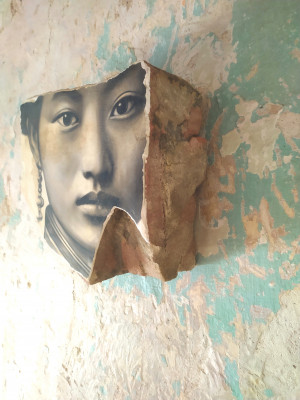In quest’opera, Toni Alfano trasforma il linguaggio del descialbo in una dimensione quasi scultorea. Non è più solo immagine: è un frammento fisico. Lo sguardo della protagonista, vivo e magnetico, contrasta con la materia grezza e consumata che lo circonda, creando un’elegante tensione tra passato e presente.