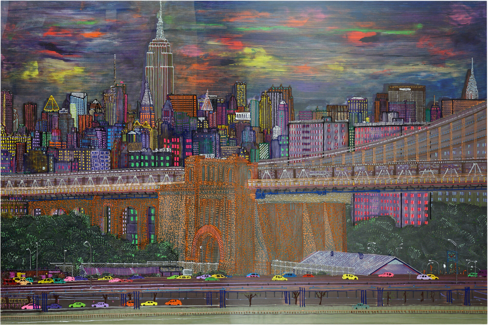 Il ponte, in primo piano, non è solo un passaggio: è una soglia luminosa che introduce alla città, un arco che sembra trattenere e allo stesso tempo liberare l’energia di New York.