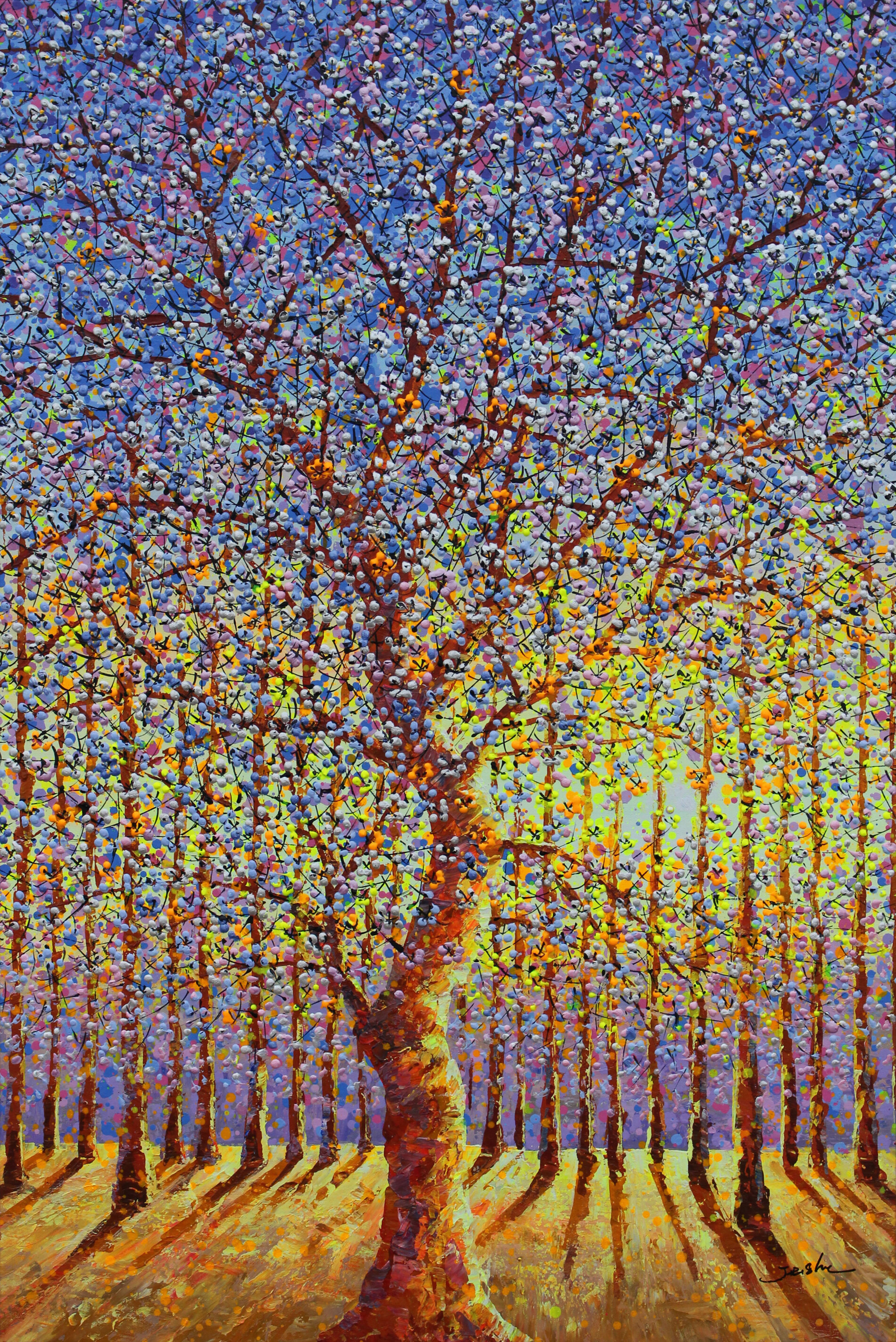 Un grande albero in fiore si staglia in un bosco immerso in una luce calda e avvolgente. I toni dorati e le ombre profonde creano movimento e profondità, rendendo l’opera luminosa e molto scenografica. Un dipinto che trasmette una sensazione di calore, energia e armonia, capace di avvolgere lo sguardo con naturale intensità.