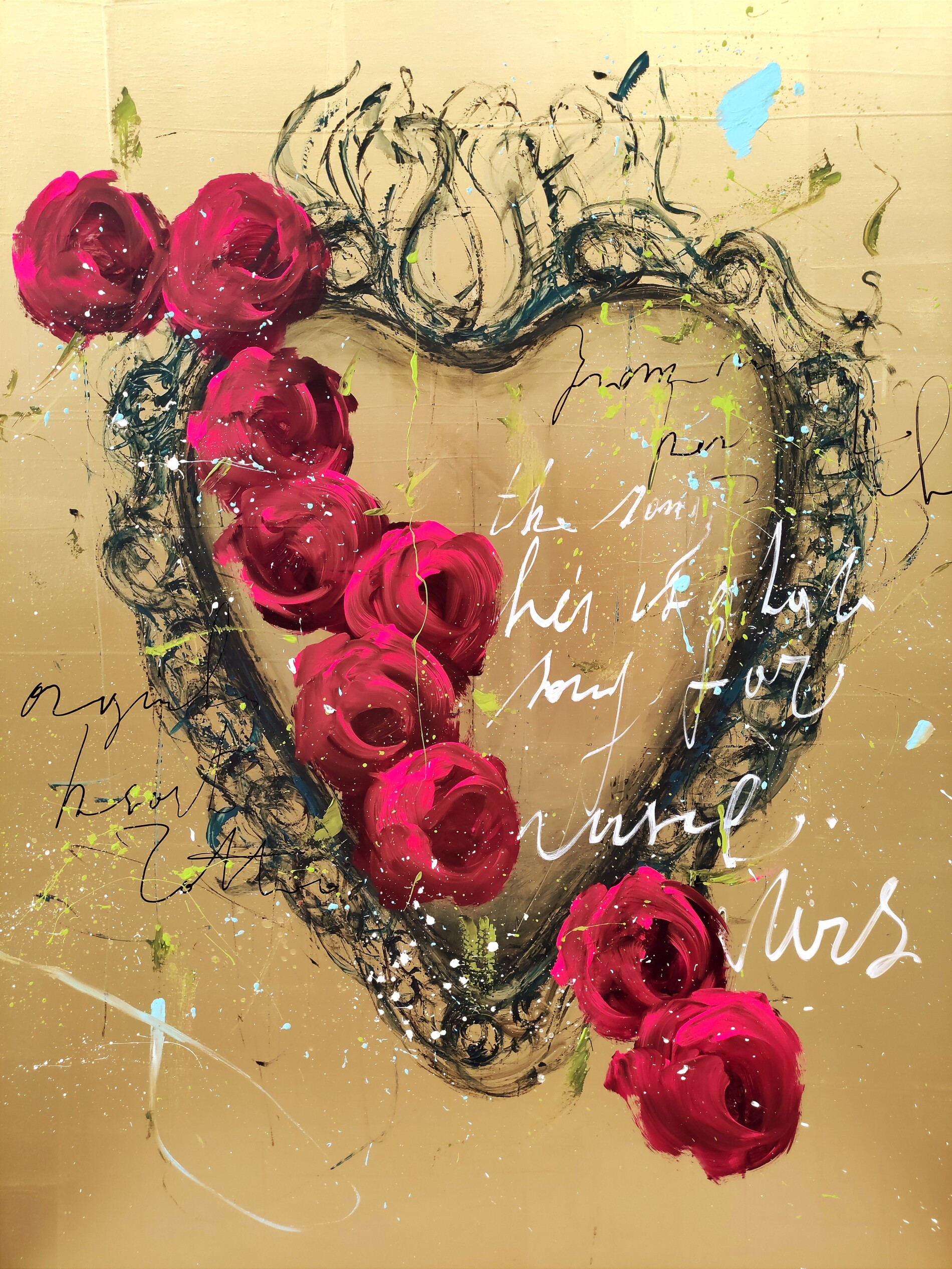 La forza narrativa di Luca Bellandi si esprime qui con un cuore dorato che diventa simbolo, reliquia e dichiarazione. La cornice barocca, tratteggiata con segni rapidi e vibranti, si intreccia con rose cremisi e magenta, dipinte con quella spontaneità gestuale che è cifra distintiva dell’artista. Ogni fiore sembra affiorare dal fondo come una nota musicale, mentre la scrittura a mano lascia intravedere frammenti di emozioni non dette.
