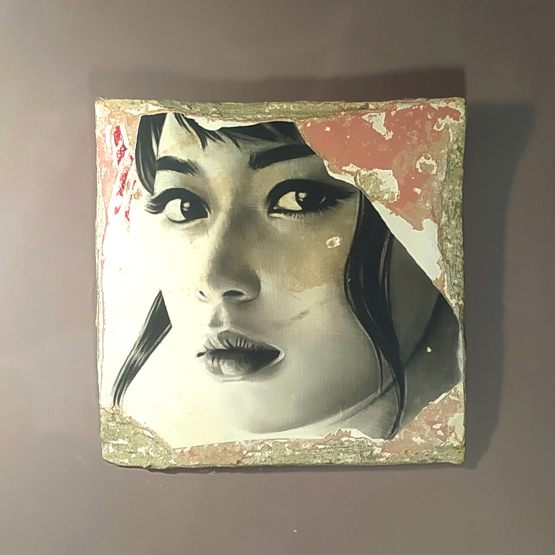 I dipinti di Toni Alfano sono una magica illusione, realizzati su cartone ricoperto da un sottile strato di cemento. Attraverso una lenta stratificazione di tempera, l’artista ricrea l’effetto di un muro antico, mentre le figure prendono forma con carboncino e smalti bituminosi. La tecnica, di origine antica, si chiama descialbo e consiste nella rimozione degli strati pittorici, come nel restauro degli affreschi. Proprio questo processo richiama il tema della memoria, intesa come stratificazione di segni, immagini e tempo.