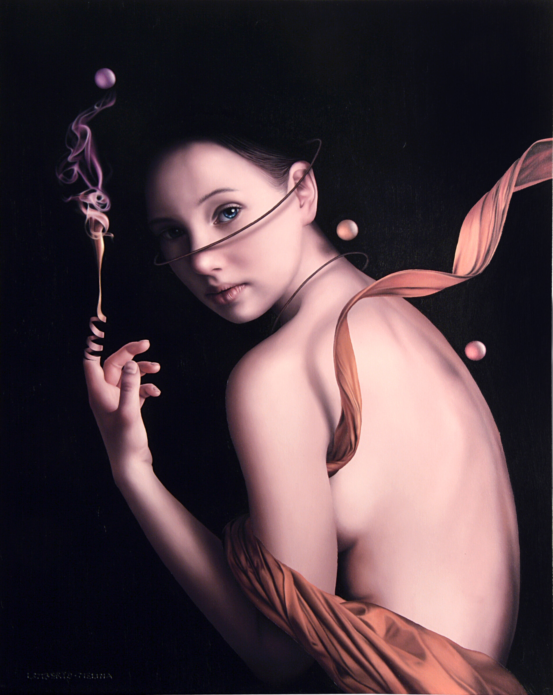 Un angelo? Un Essere proveniente da Mondi Altri? Chi è l'eterea donna protagonista di questa Questa toccante opera olio su tela del maestro iperrealista Lamberto Melina non è dato saperlo. Quello che è certo è che, più che a un dipinto, ci troviamo di fronte a un invito all'esercizio spirituale della libertà per il raggiungimento di una coscienza superiore, a collegare la propria spiritualità al chakra del cuore, ovvero alla fonte di ogni bellezza e bontà e perdono (nell’opera raffigurate dalle tre sfere posizionate sul 7°, 5° e 4° chakra), le tre forze che salveranno noi e questo splendido mondo.