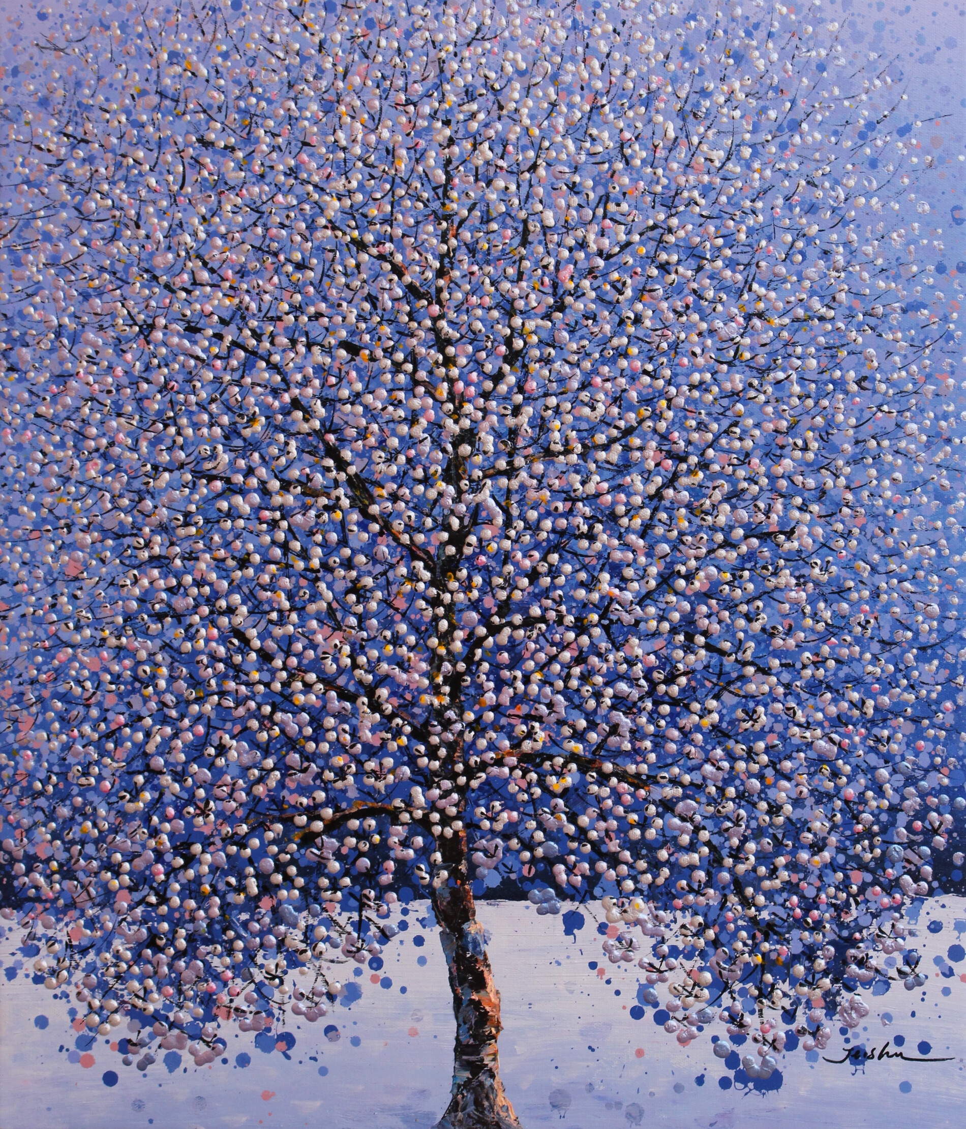 Al centro di questo paesaggio onirico, l’artista cinese Je Shen dipinge un albero lilla, giallo e azzurro che emerge delicato dalla neve immacolata. I toni eterei e la luce soffusa creano un’atmosfera incantata che trasforma il paesaggio in una favola di silenzio e magia sospesa.
