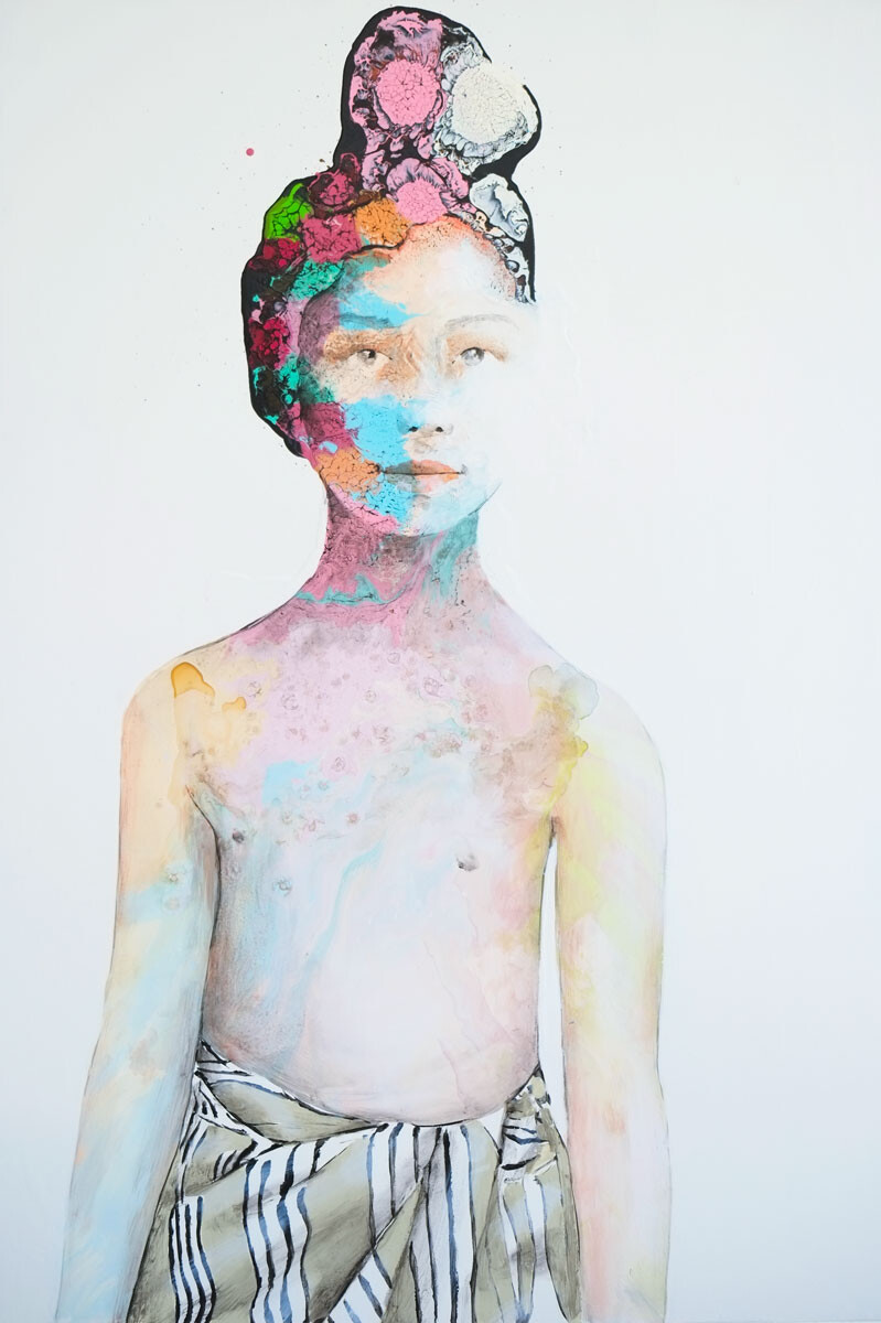 Questa composizione in medio formato colpisce per un equilibrio intimo e raffinato. Il corpo è leggero, quasi evanescente, mentre l’energia si concentra nella testa, dove il colore si fa materia e identità in trasformazione. Il contrasto tra vuoto e densità crea una tensione sottile, elegante e silenziosa. Un lavoro profondo e coinvolgente, capace di rivelarsi nel tempo.