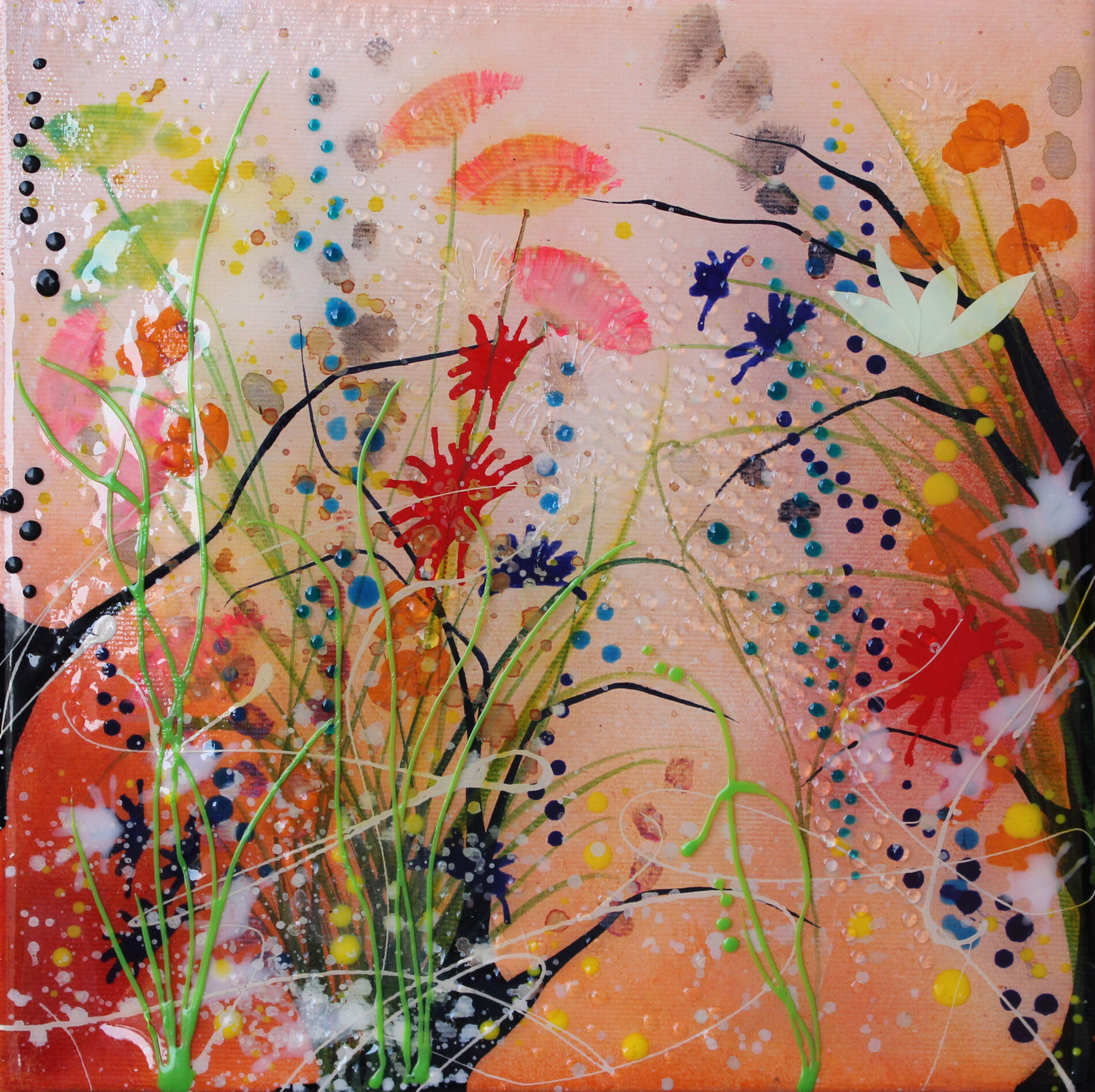 Sara Paini, in questa composizione di piccole dimensioni, apre la visione dello spettatore su un frammento di natura vibrante, dove il colore sembra prendere vita sulla superficie. Le tonalità aranciate avvolgono la scena con un calore morbido, mentre i petali rossi, rosa e blu si intrecciano a segni fluidi e gocce luminose. L’occhio viene guidato da movimenti sottili, traiettorie leggere che suggeriscono un paesaggio in festa, attraversato da energia e delicatezza allo stesso tempo.
