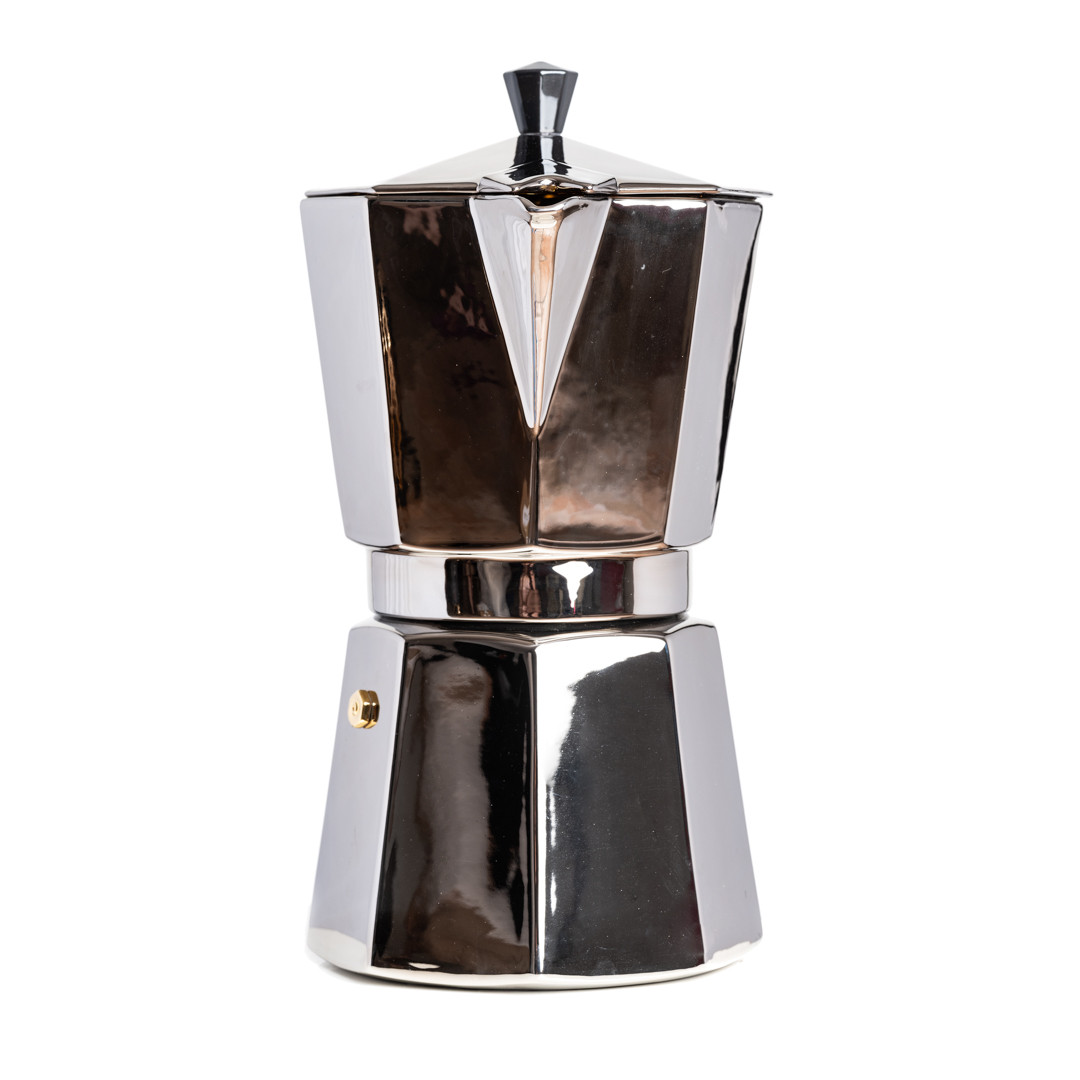 Un'iconica caffettiera italiana in ceramica smaltata. L'opera dell'artista della ceramica celebra il rituale quotidiano del caffè, trasformando un oggetto comune in una scultura di design.