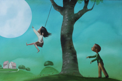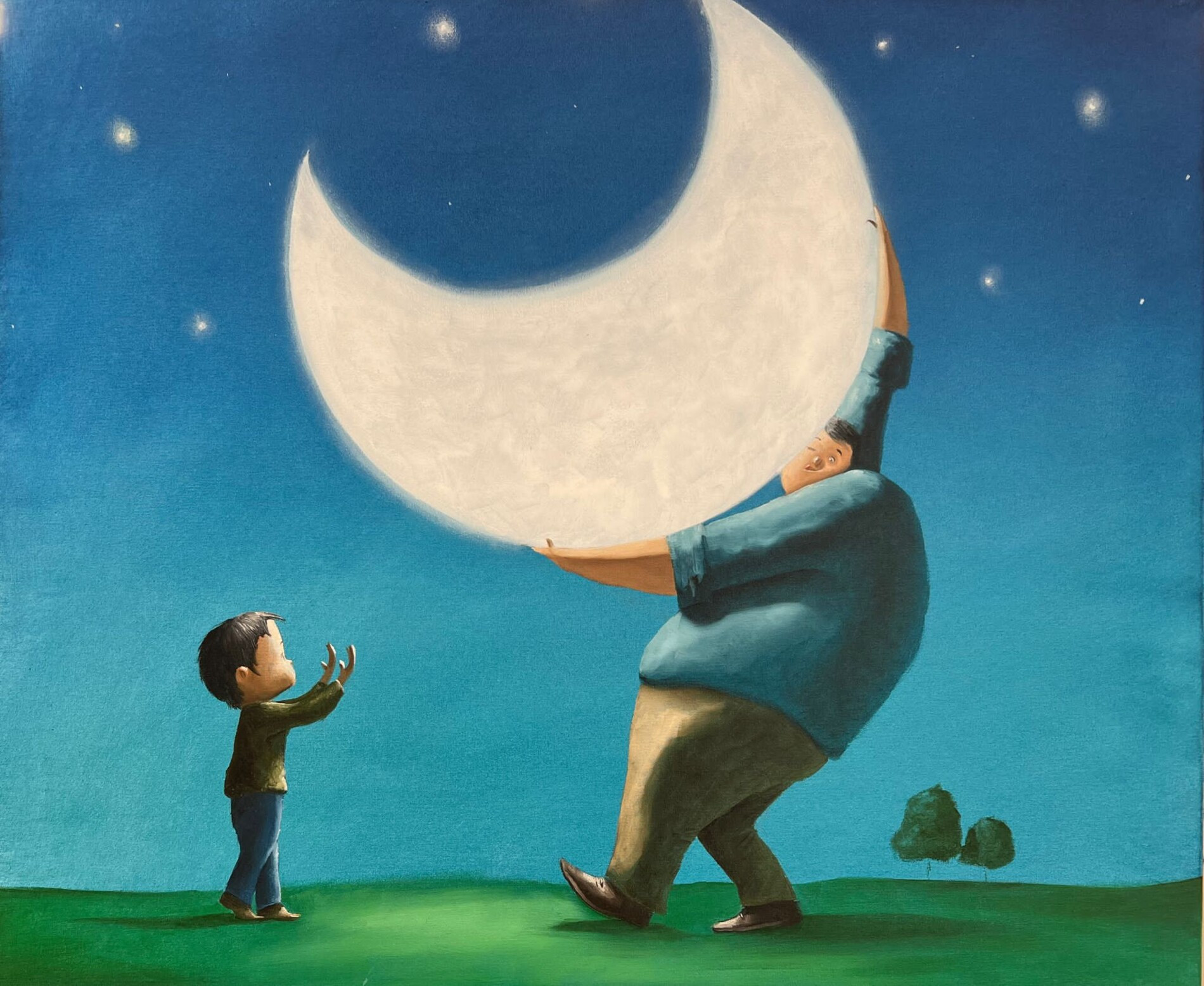 In una notte quieta, in cui il blu si fa velluto, un padre solleva la luna e la offre al proprio bambino come si porgerebbe un segreto prezioso. L’astro bianco, colto nella sua luminosa pienezza, diventa un dono impossibile eppure credibile, perché nell’infanzia tutto ciò che è meraviglia trova un varco per diventare reale. La matericità della pittura emerge nella morbidezza dei contorni e nella pienezza cromatica, creando una dimensione onirica e affettiva, capace di parlare a ogni età.
