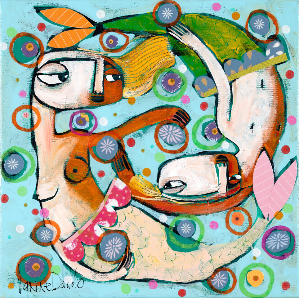 L’arte di Janine Daddo si distingue per un linguaggio pittorico immediatamente riconoscibile, costruito attraverso figure stilizzate, volumi semplificati e una forte attenzione alla superficie. La pittura è stratificata, materica, spesso arricchita da pattern decorativi e contrasti cromatici decisi che conferiscono ritmo e profondità all’opera. Le composizioni mantengono un equilibrio tra narrazione e astrazione, lasciando spazio a interpretazioni aperte senza mai diventare descrittive. Il segno, essenziale ma espressivo, guida lo sguardo all’interno di mondi sospesi, dove la quotidianità si trasforma in una dimensione dolce, poetica e senza tempo.
