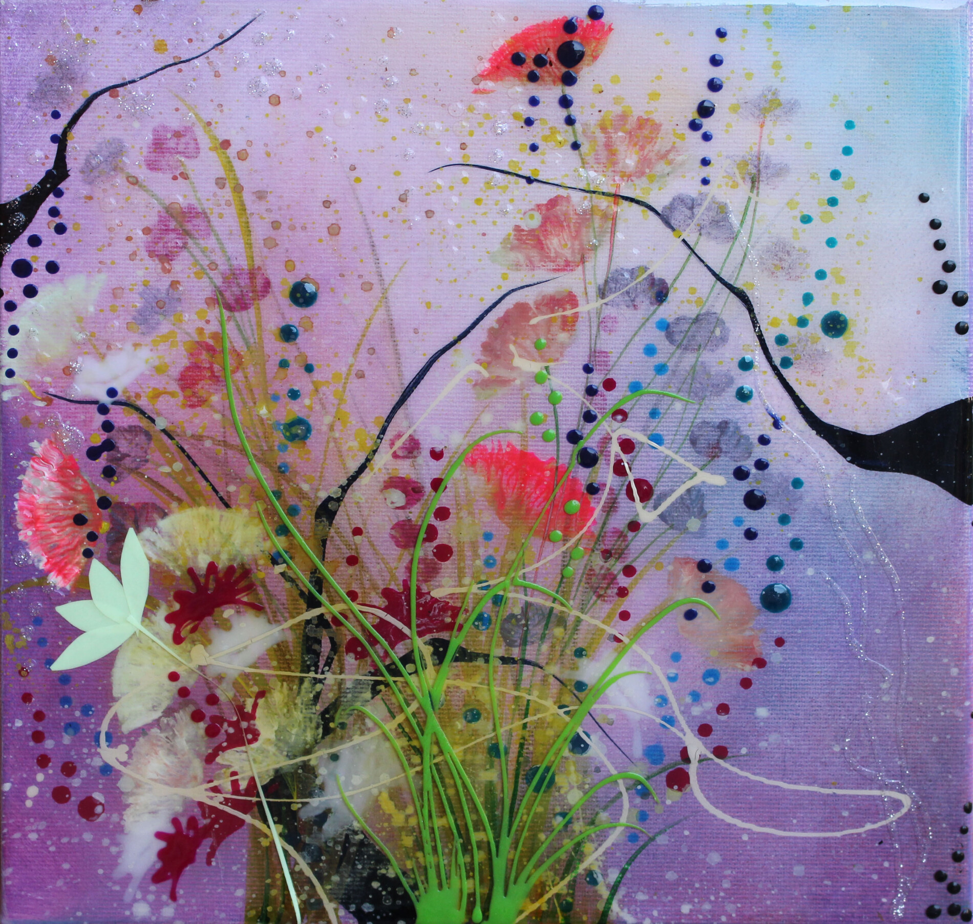 In questa tela di piccole dimensioni, Sara Paini trasforma il colore in un soffio di fantasia. Il viola e il rosa si fondono in una luce morbida che accarezza ogni dettaglio, mentre fiori accesi e segni puntinati emergono come scintille sospese nell’aria. È un’opera che profuma di sospensione e di meraviglia, un istante luminoso in cui la natura si fa poesia.