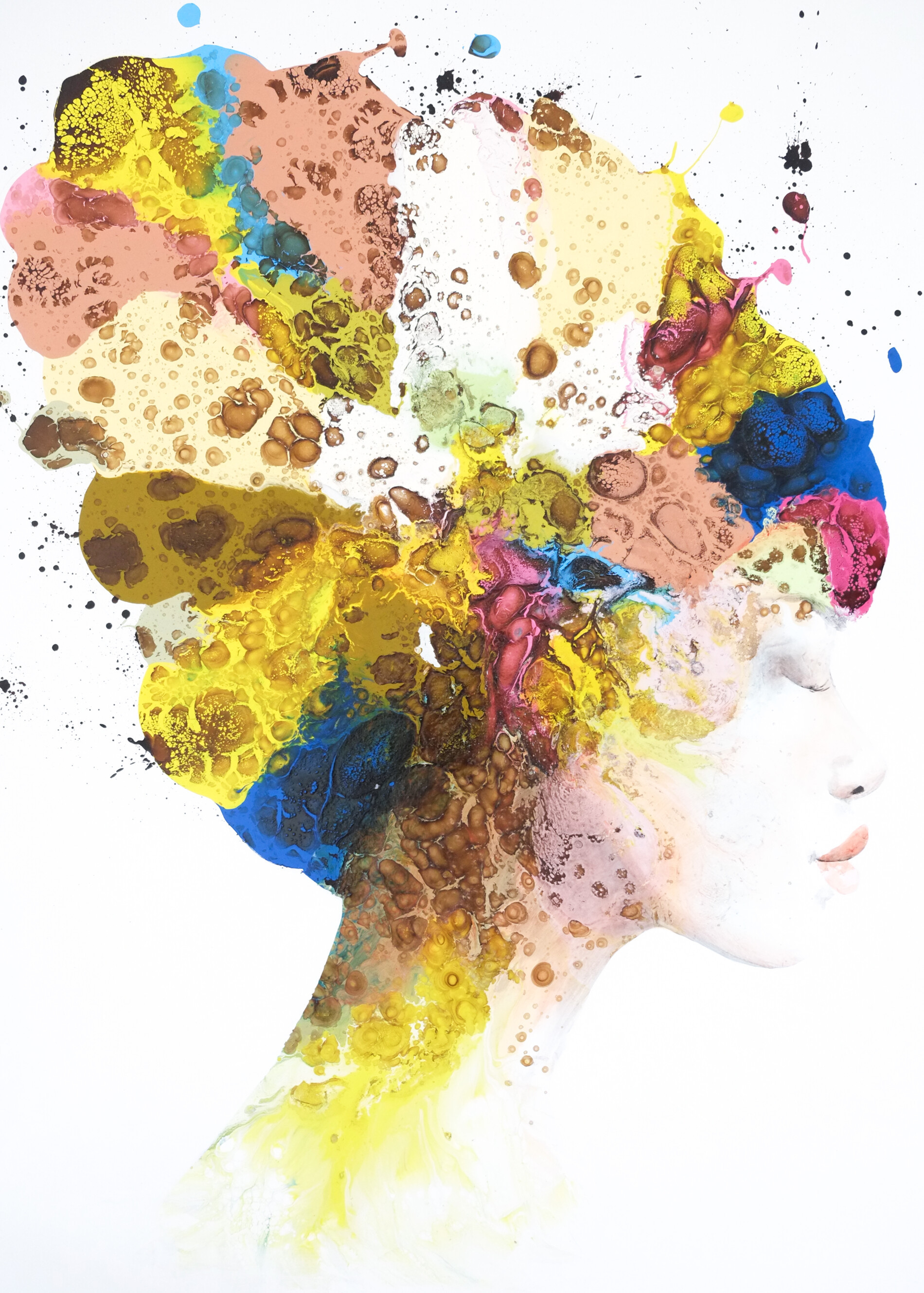 In questo profilo raccolto si concentra una quiete luminosa, interrotta solo dall’esplosione cromatica che si apre come un fiore in trasformazione. Le colature di smalti a base d’acqua e trementina generano un intreccio materico vibrante dove ocra caldi, tonalità miele, avori luminosi e accenti di blu e rosa dialogano tra loro. La delicatezza del volto, trattato con toni morbidi e impalpabili, contrasta con l’energia del colore, creando un equilibrio poetico tra silenzio interiore e vitalità espansiva.