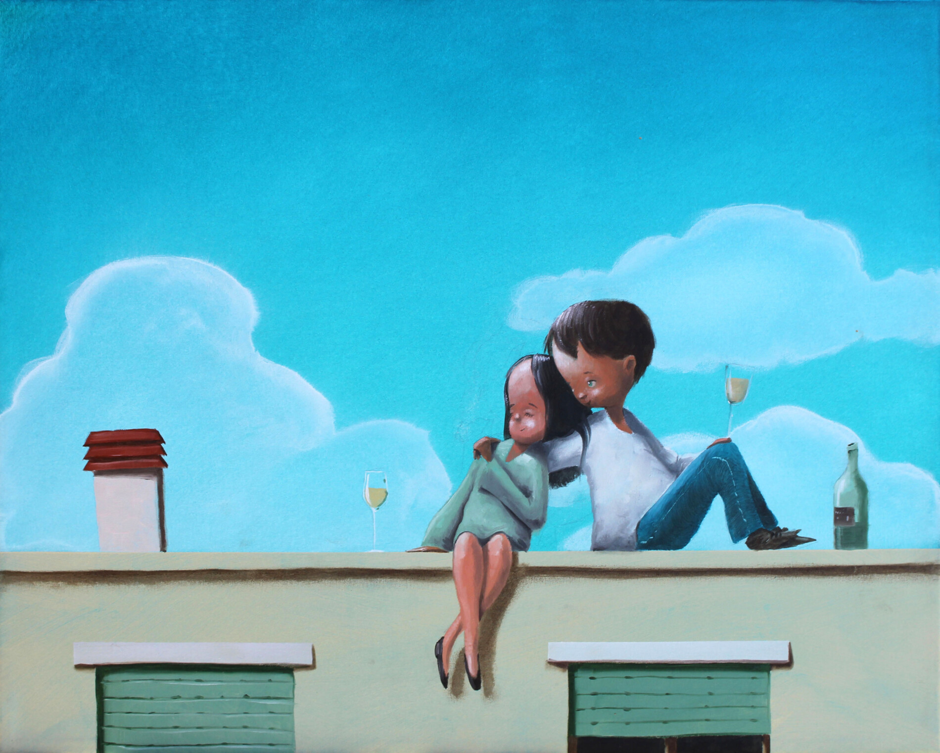 In questa piccola composizione in acrilico su tela, Diego Santini ci mostra due innamorati seduti sul tetto di una casa, abbracciati sotto un cielo che sembra non finire mai. Con un bicchiere di vino condividono la dolcezza del momento, immersi in una complicità che li rende leggeri, quasi sospesi sopra il mondo in un momento che profuma di libertà.
