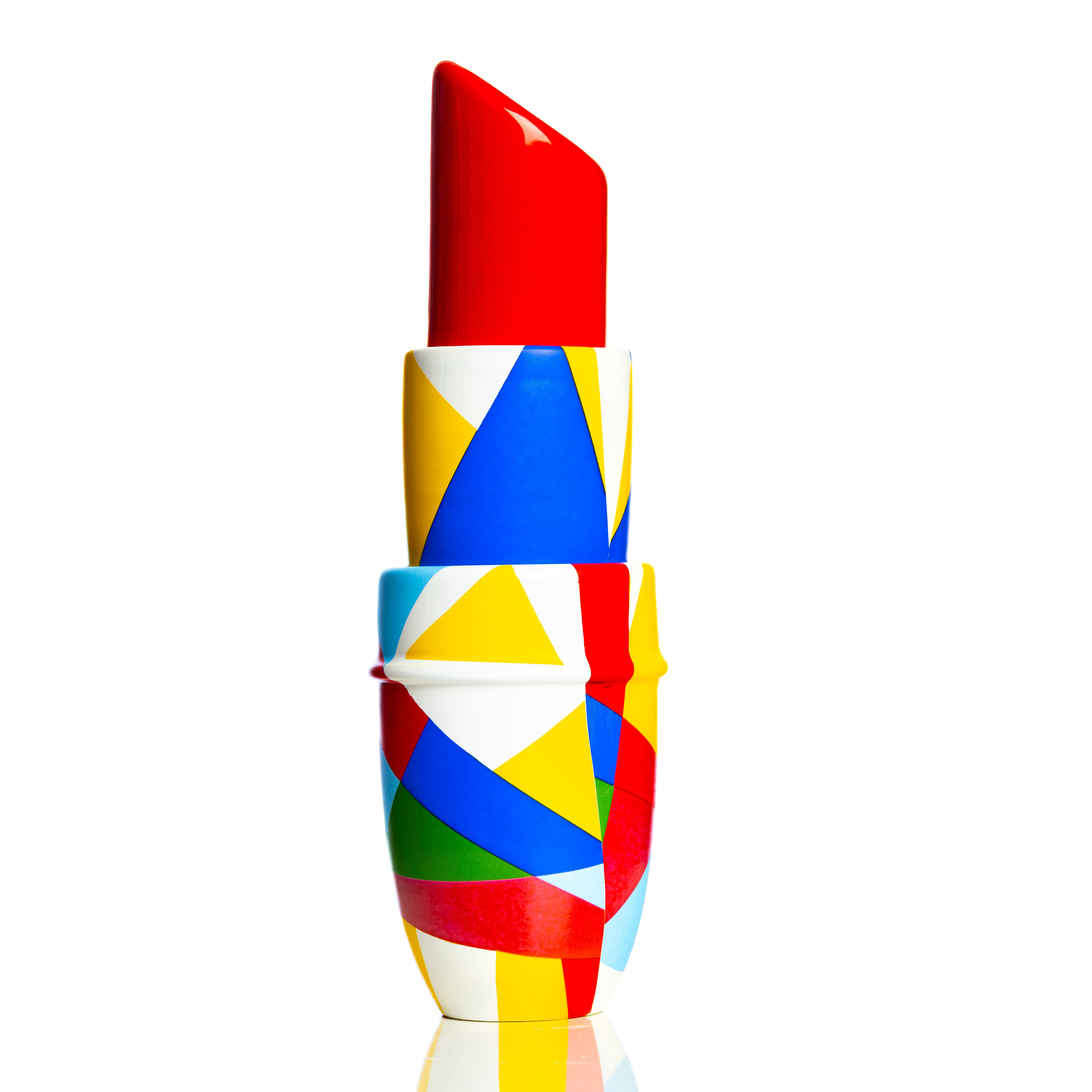 Una piccola scultura, un bijoux, che gioca con forme geometriche e colori vivaci. La ceramica smaltata dona un aspetto lucente al mini rossetto arlecchino, trasformando l'opera in un elemento decorativo accattivante.