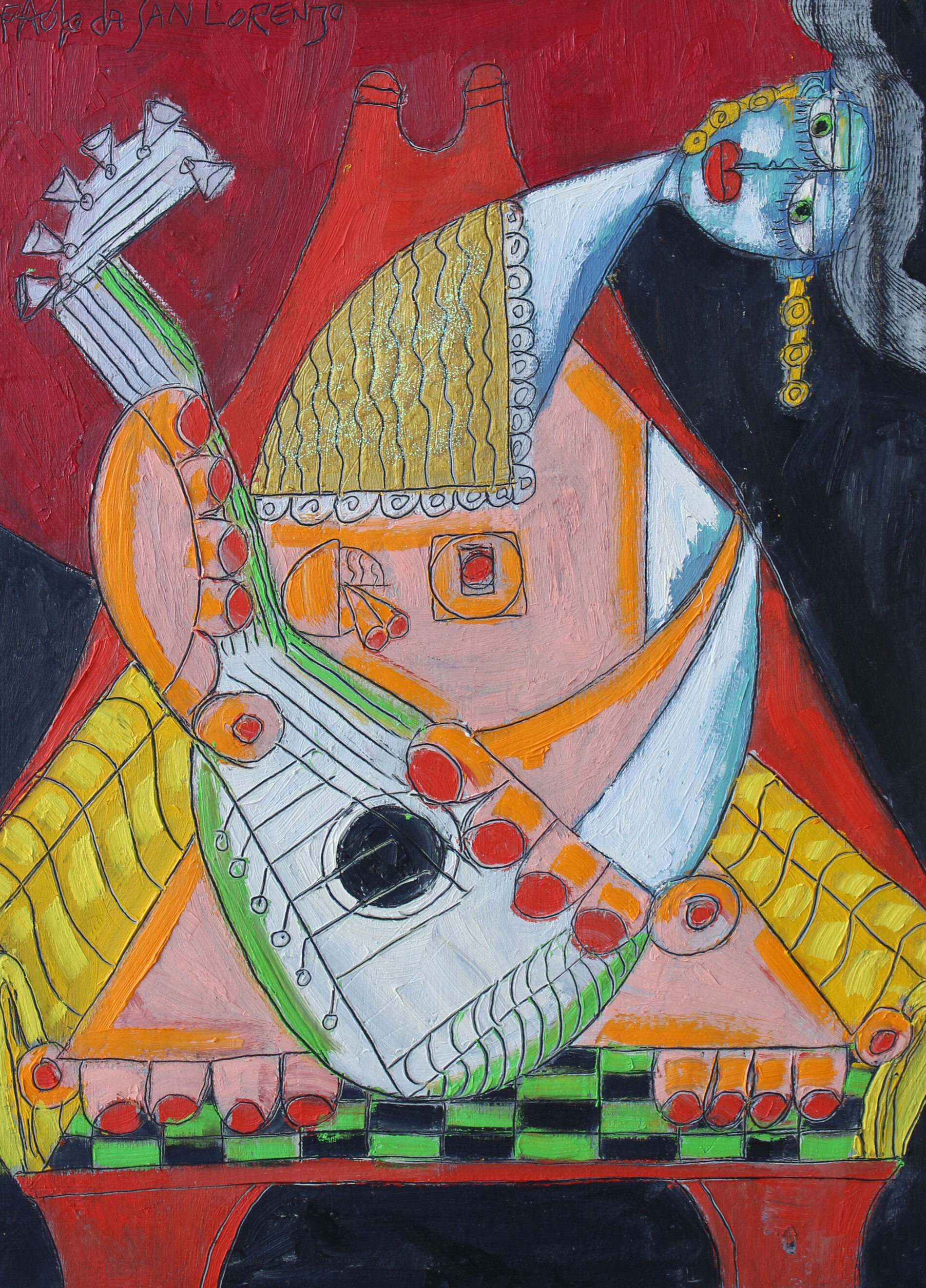 "Donna con chitarra" di Paolo da San Lorenzo è un dipinto ad olio su tela di medie dimensioni che rappresenta magnificamente una suonatrice immersa in un contesto di grande energia e movimento. L'uso sapiente dei colori intensi, delle texture e delle sfumature crea un effetto di "confusa armonia", caratteristico dello stile dell'artista. Questa tela fa parte di una serie di opere che esplorano il tema della musica e della femminilità, dimostrando la capacità di Paolo da San Lorenzo di fondere forma e sentimento in un unico gesto pittorico
