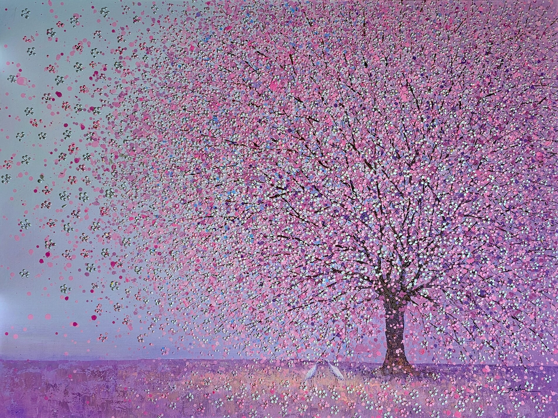 In questa composizione, parte dell’ultima produzione di Je Shen, un grande albero in fiore domina la scena, espandendosi in una fioritura leggera e luminosa nelle tonalità del rosa.La superficie, costruita attraverso la caratteristica tecnica a contagocce, crea una trama vibrante che dona profondità e movimento all’immagine. Un’opera armoniosa e avvolgente, capace di esprimere con immediatezza la dimensione più delicata e poetica della ricerca dell’artista.