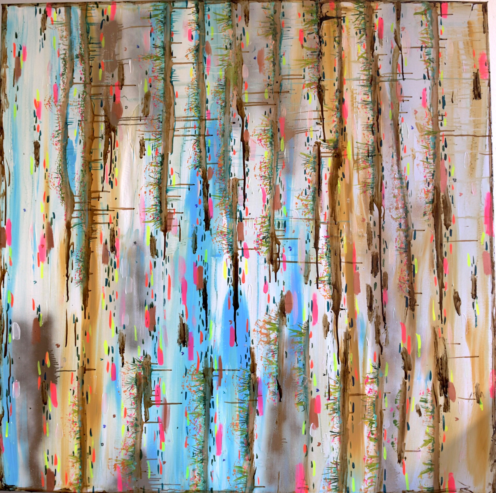 L’opera Bark dell’artista neozelandese Veronica Green richiama la trama viva e mutevole della corteccia arborea, trasformandola in un paesaggio astratto fatto di verticalità stratificate, colature materiche e vibrazioni cromatiche. Le tonalità terrose si intrecciano con innesti azzurri, rosati e fosforescenti, suggerendo una natura in continua metamorfosi. Bark indaga il rapporto tra superficie e profondità, tra ciò che la materia rivela e ciò che trattiene: i pigmenti luminescenti, emergendo nel buio, svelano un paesaggio segreto e vibrante.