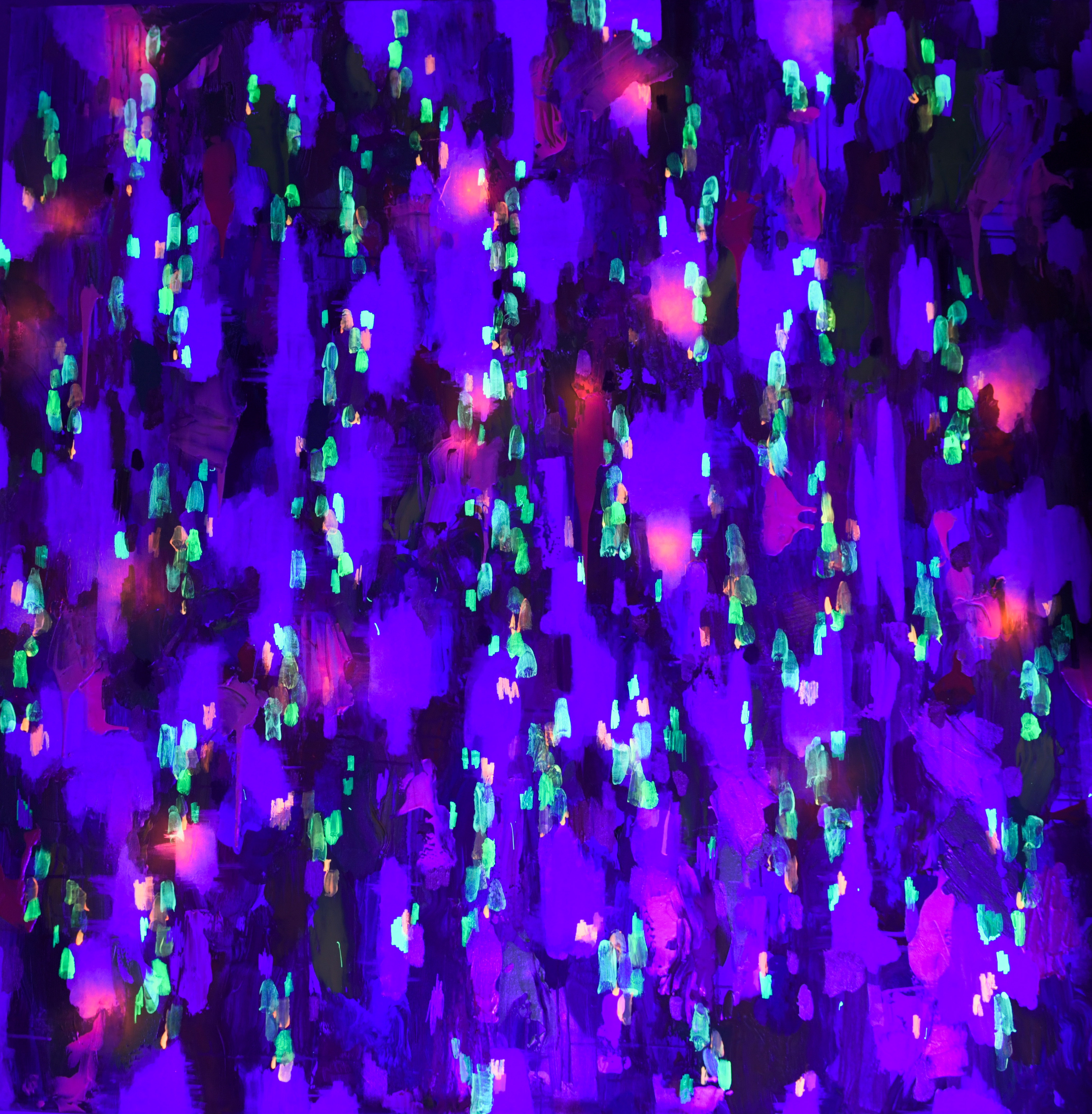 In Nest, Veronica Green costruisce un intreccio pulsante di forme e cromie, un habitat visivo in cui la materia pittorica sembra germogliare e stratificarsi. Macchie verdi, rosa, viola e oro si sovrappongono come foglie, petali e frammenti organici, mentre aperture bianche interrompono il ritmo e suggeriscono spazi di respiro, varchi di luce. Il dipinto evoca un nido vegetale in continua formazione, vivo, vibrante, in cui ogni segno partecipa a un equilibrio fragile e dinamico. I pigmenti fosforescenti, che emergono nel buio, rivelano una dimensione segreta: un sottobosco luminoso che trasforma l’opera in un paesaggio notturno, intimo e pulsante di nuova energia.