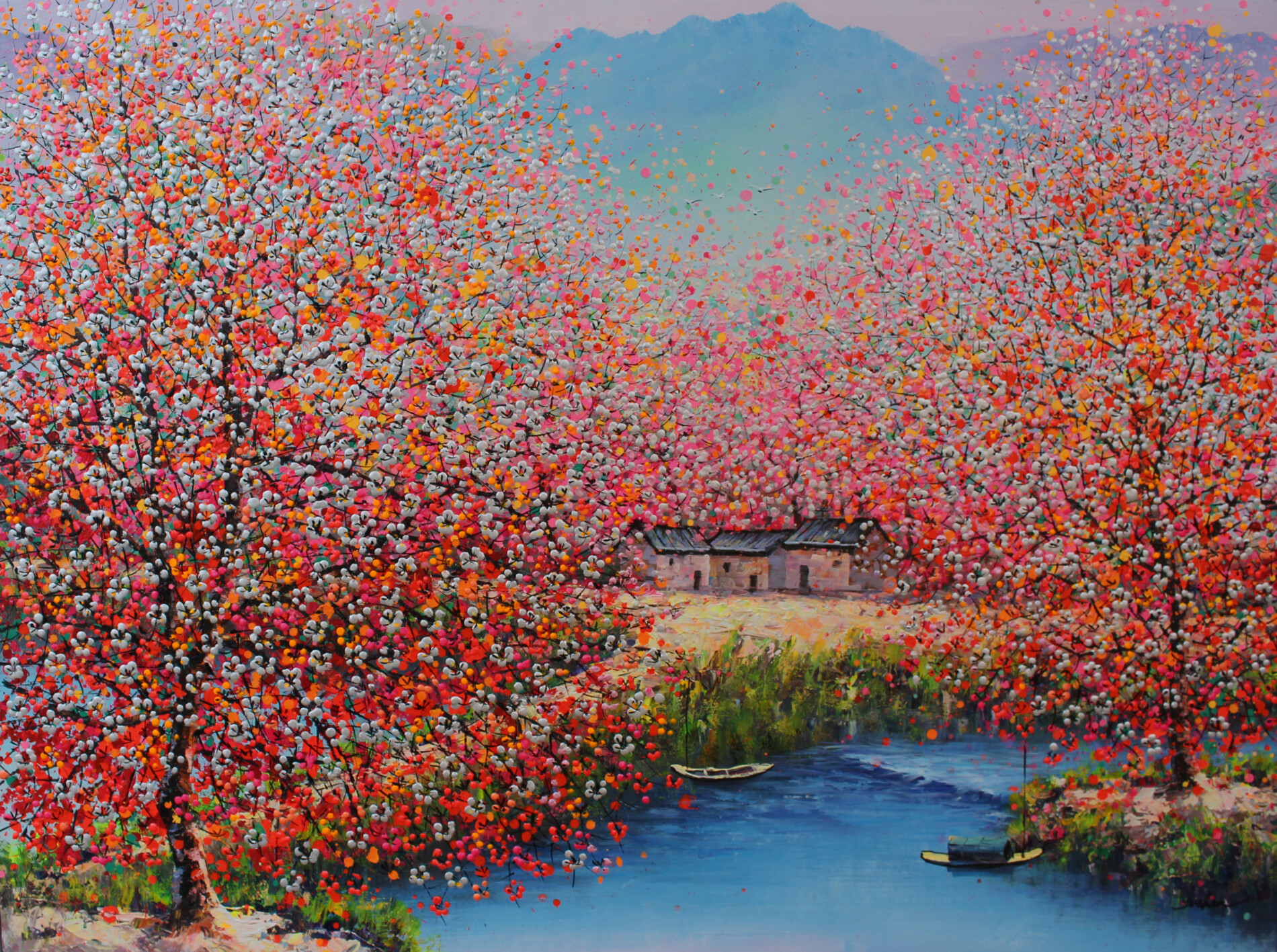 In Meditation 631, Je Shen immerge lo spettatore in un paesaggio poetico, dove la natura esplode in una sinfonia di colori vibranti. Gli alberi, resi attraverso una tecnica puntiforme ricca e sensoriale, creano una fioritura quasi sospesa, un tappeto di petali che avvolge ogni elemento della scena. Al centro, alcune case rurali emergono come un rifugio silenzioso, mentre il fiume in primo piano riflette una calma profonda, interrotta solo dalla presenza discreta di piccole barche.
