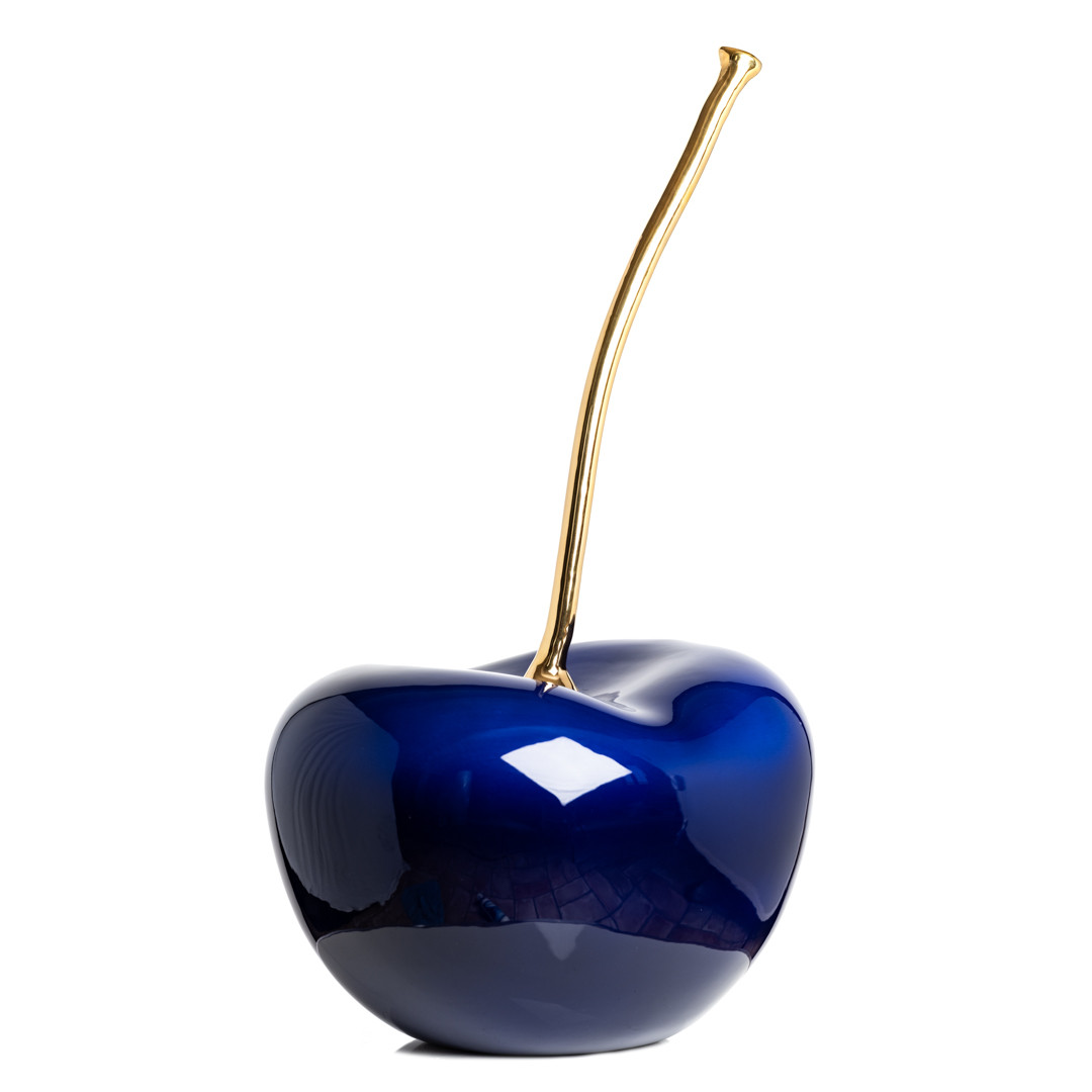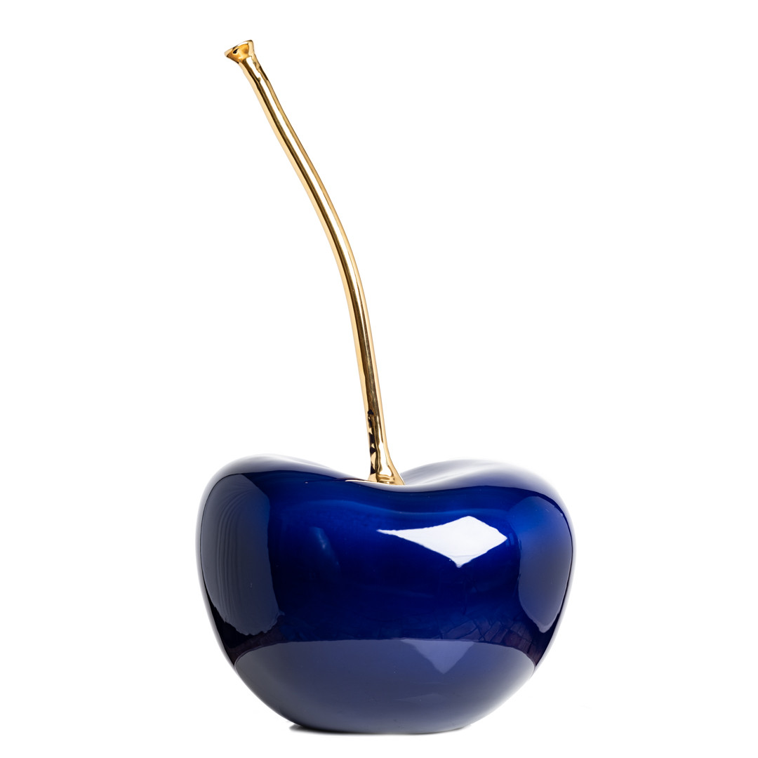 Una ciliegia di ceramica dalle tonalità blu profondo con gambo dorato: Cherry Blue è una scultura magnetica e sofisticata, capace di attirare lo sguardo e impreziosire ogni contesto. Una sintesi tra minimalismo e sensualità visiva.
