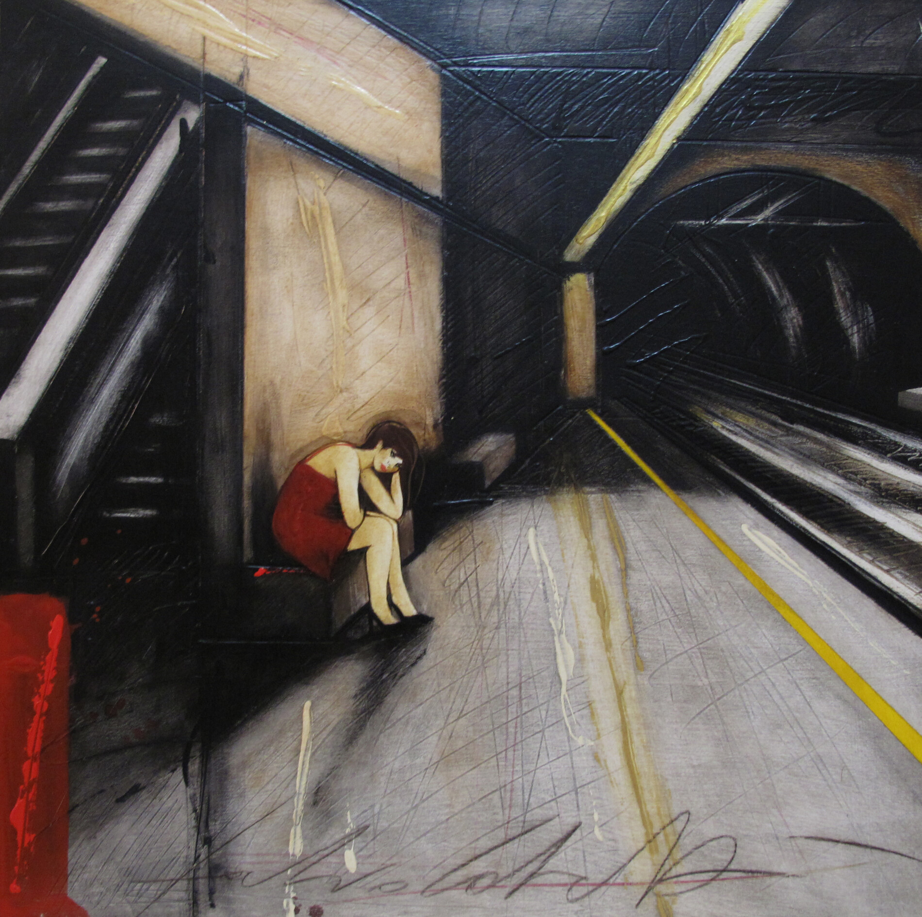 "Le Tue Attese" è un dipinto di Fabio Calvetti che racchiude tutta la potenza narrativa dell’attesa. La donna, vestita di rosso, è seduta in una stazione deserta, illuminata da luci fredde e taglienti che accentuano il senso di malinconia. Le linee prospettiche della metropolitana portano lo sguardo verso un futuro incerto, mentre il contrasto cromatico tra il nero dello sfondo e il rosso dell’abito suggerisce un conflitto interiore tra passione e malinconia.