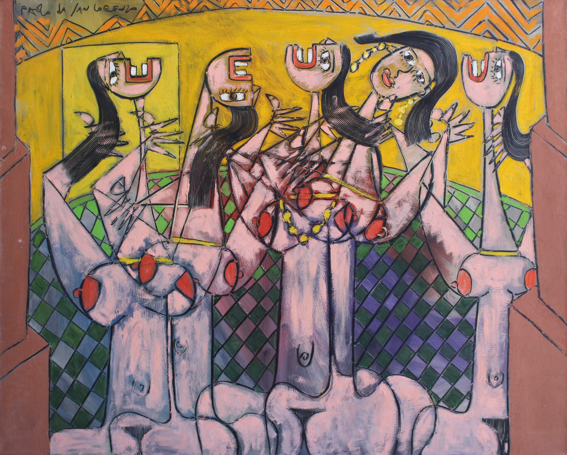 In Le ballerine del Lido, Paolo da San Lorenzo traduce il movimento e la leggerezza del gesto in una costruzione formale solida e ritmata. Le figure femminili, stilizzate e frammentate secondo una grammatica post-cubista, si dispongono nello spazio come in una danza sospesa tra equilibrio e tensione. Il colore, vibrante e luminoso, dialoga con il segno inciso, creando una composizione energica e armonica, dove il corpo diventa ritmo, architettura e poesia visiva.
