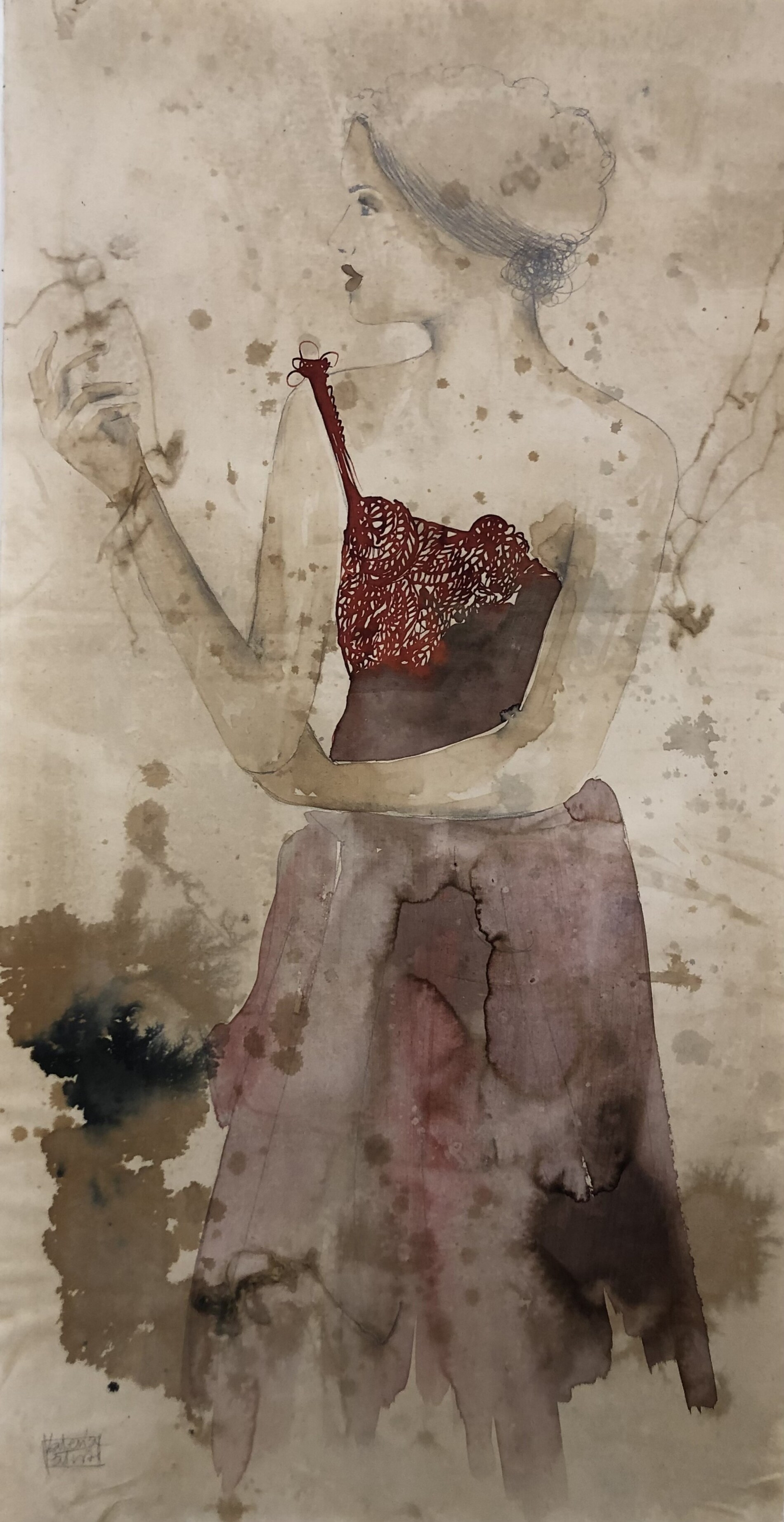 Una figura evanescente emerge da velature e macchie, nate da una lavorazione materica che lascia fluire acqua, pigmenti e trasparenze come memorie sulla tela. Il profilo delicato contrasta con l’elegante bustino rosso,che pulsa al centro dell’opera come un segreto da custodire.