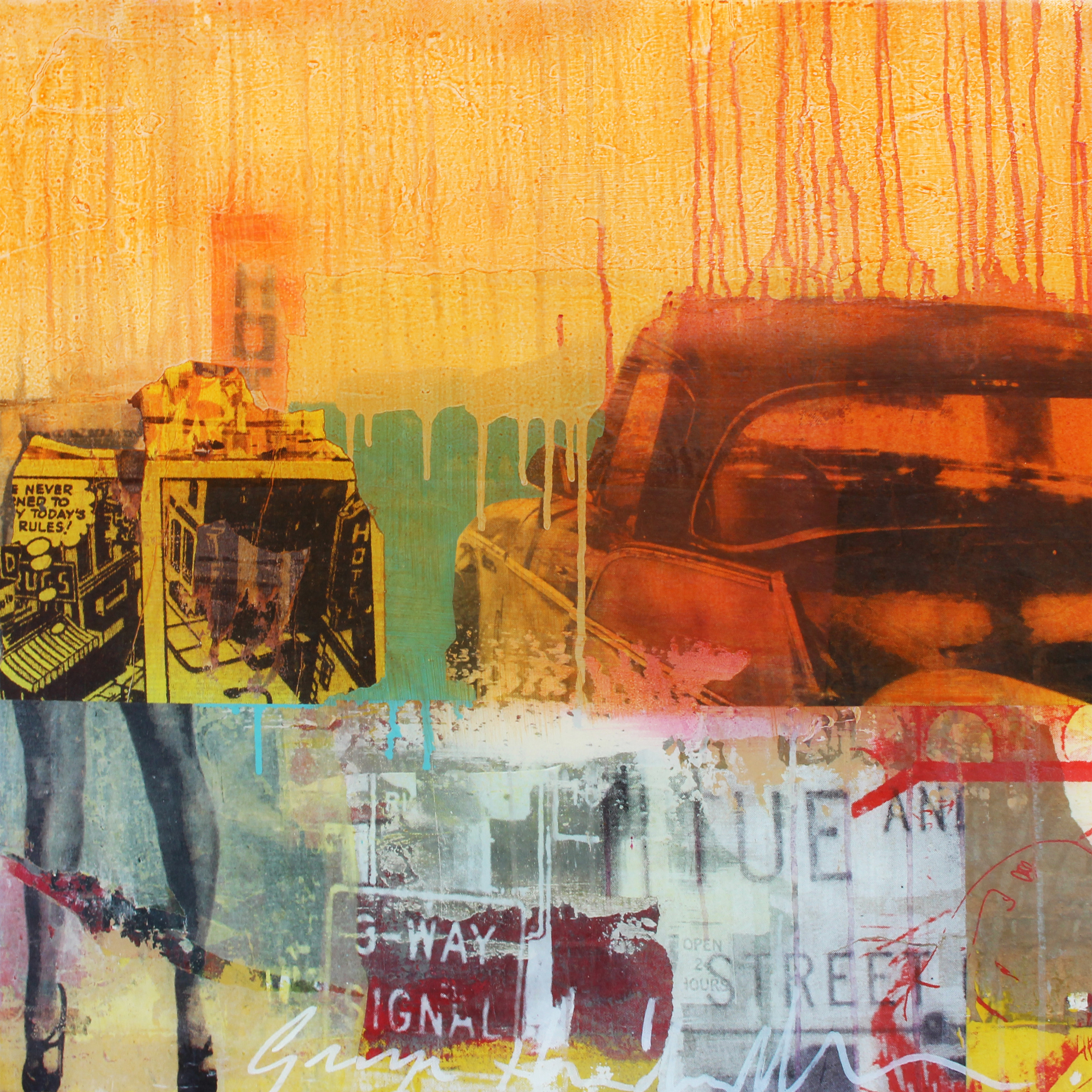 In questo Road Trip, il formato quadrato concentra l’energia visiva in un campo cromatico vibrante. Heidweiller gioca con trasparenze e stratificazioni grazie alla resina epossidica, che amplifica la luminosità dei colori. Il risultato è una superficie brillante, in cui dettagli grafici e pittorici convivono in un equilibrio dinamico.