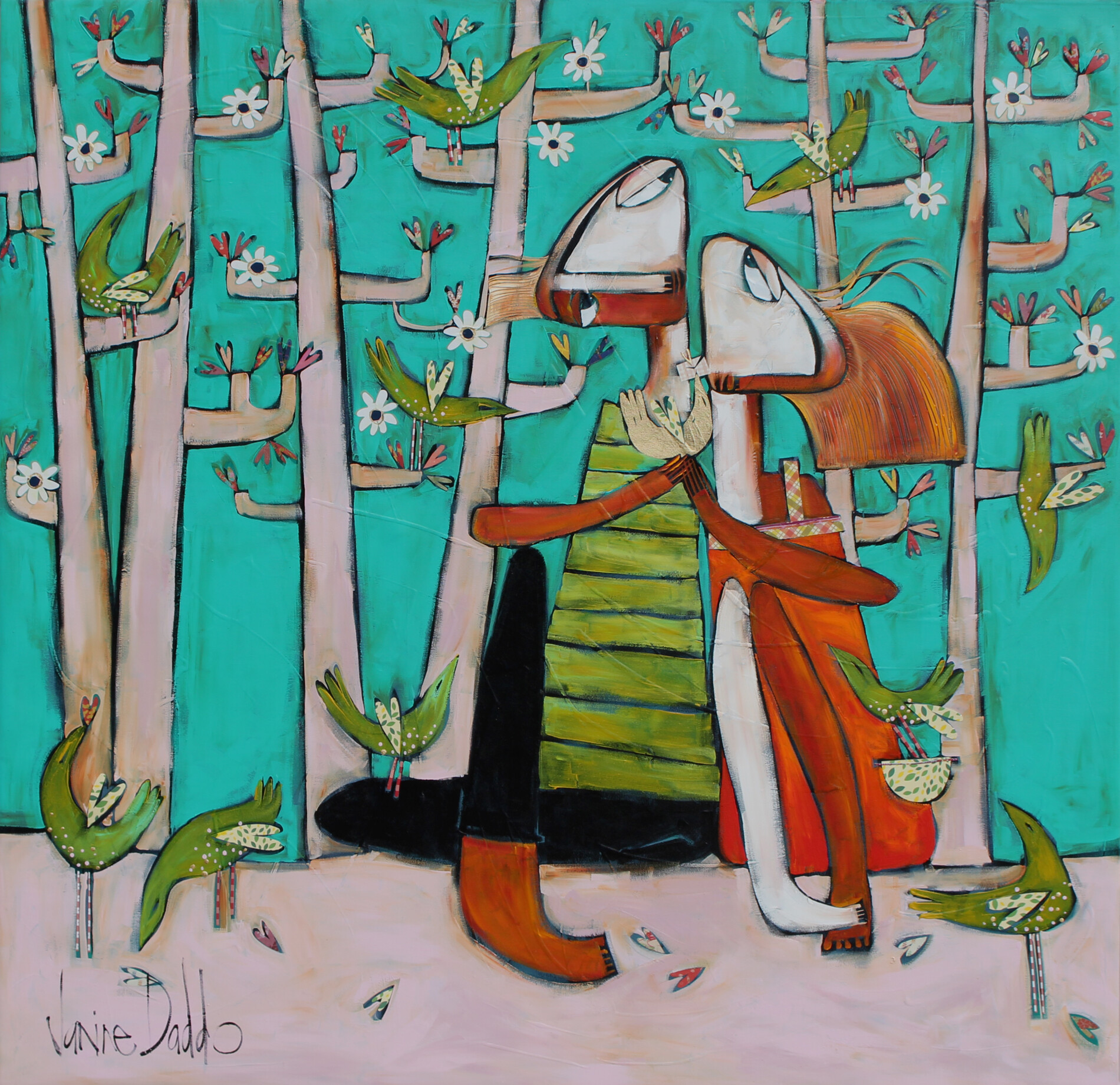 Tra cieli azzurri e campi dorati, in questa opera a tecnica mista su tela l'artista australiana Janine Daddo ritrae una coppia riceve messaggi d’amore portati da uccelli dorati. I fiori e i gesti delicati raccontano un’intensa connessione emotiva fatta di parole non dette e sentimenti sinceri.
