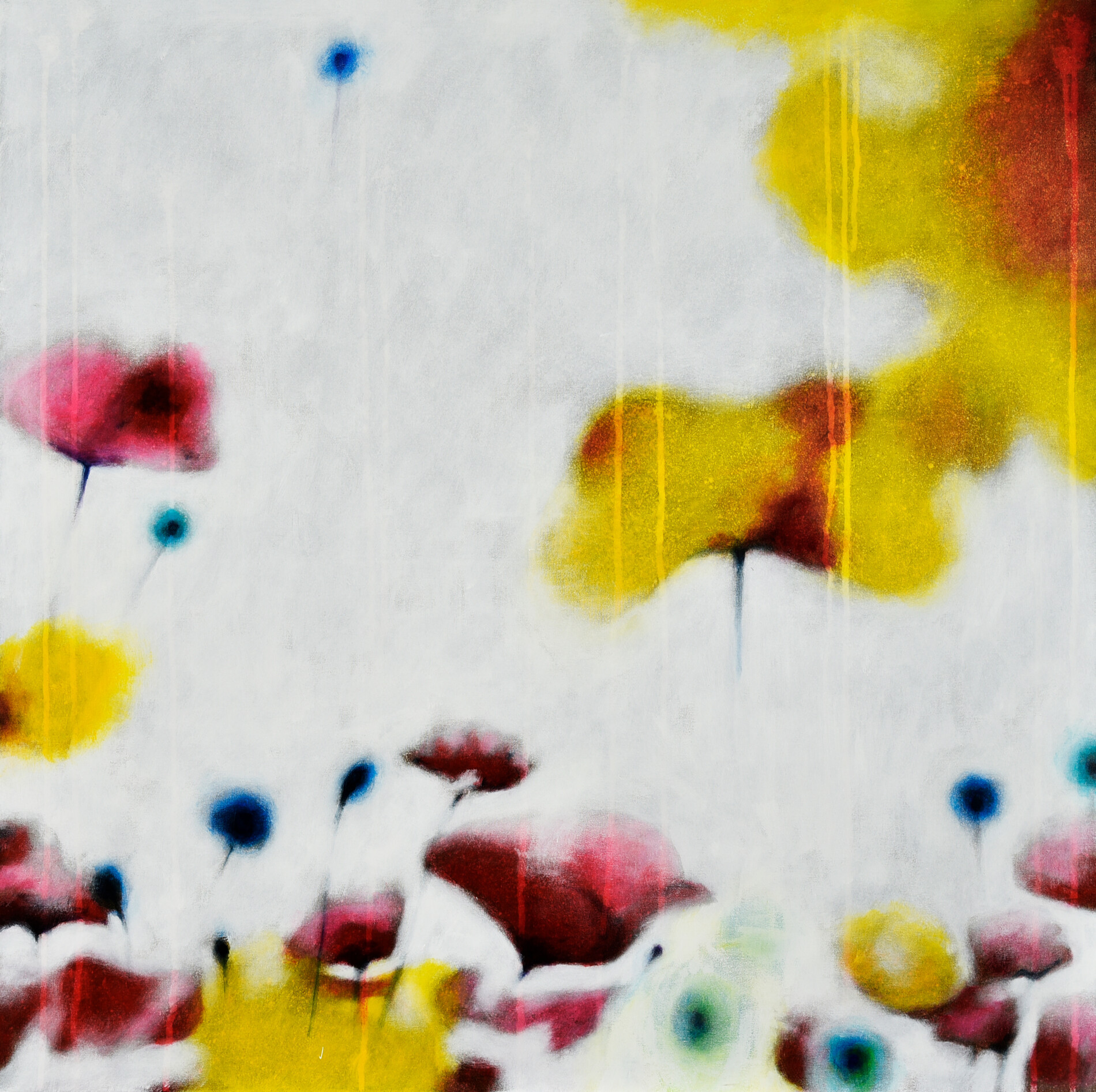 Le tonalità gialle brillano come raggi di sole, mentre i rossi profondi evocano la forza e il calore della vita. Ogni petalo sembra pulsare, animato da un movimento quasi musicale, mentre si intrecciano in una composizione che invita lo spettatore a perdersi nella loro bellezza.