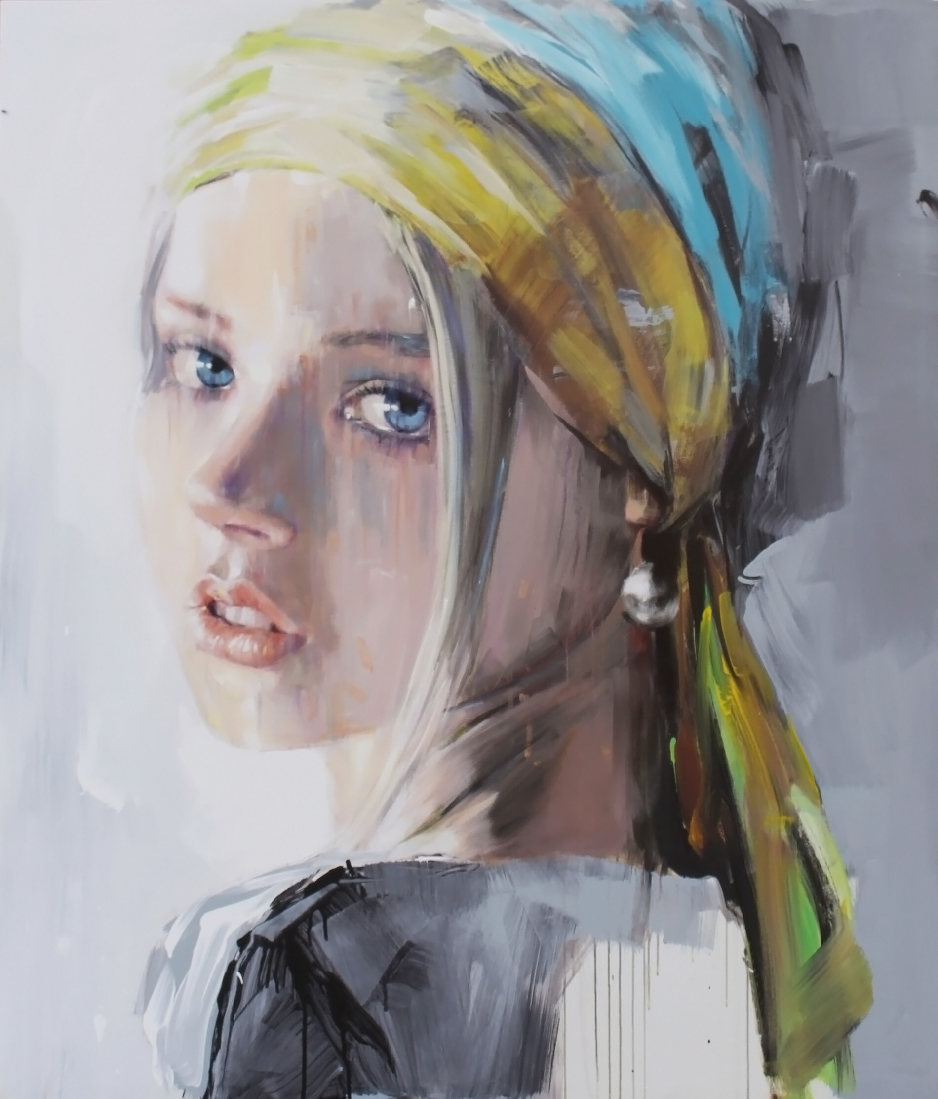 In quest’opera Pier Toffoletti propone un ritratto femminile di forte impatto visivo, in cui realismo e gesto pittorico convivono in un equilibrio raffinato. I colori, tra grigi perlacei, tocchi caldi e accensioni di azzurro e verde, costruiscono una superficie dinamica e vibrante. La materia pittorica, visibile e stratificata, contribuisce a restituire un’immagine intensa e contemporanea, in cui lo sguardo della protagonista diventa punto di attrazione emotiva e silenziosa.