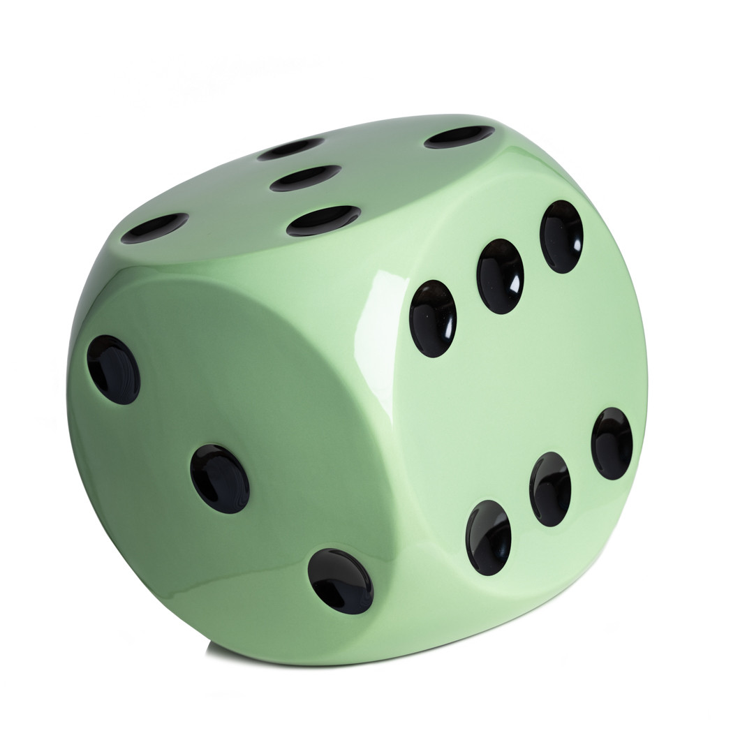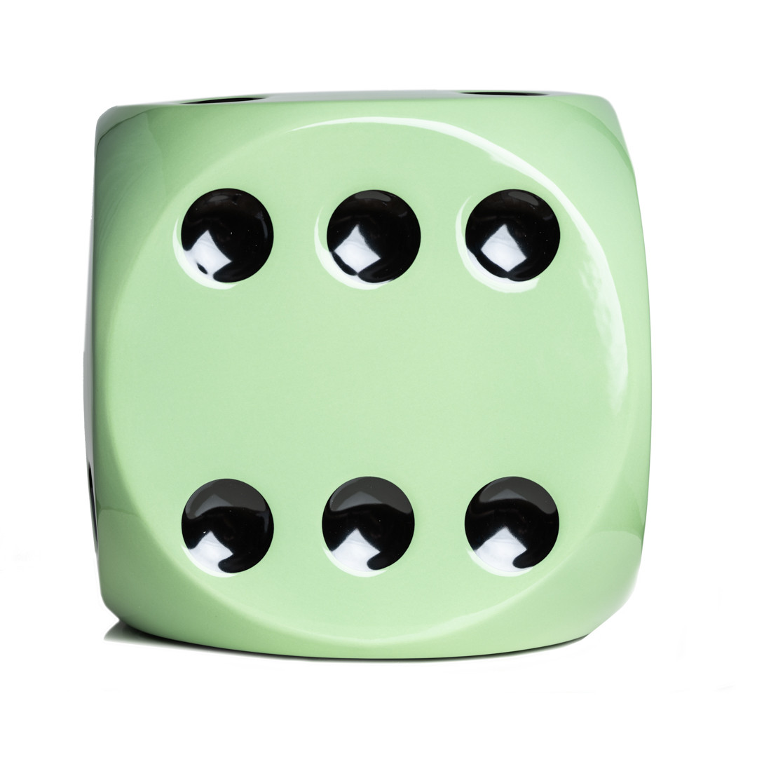Con la sua superficie verde lucida e i puntini neri incavati, “Bluff Verde” rievoca l’iconografia ludica del dado, trasformata però in oggetto scultoreo dal fascino pop. Giorgio Laveri gioca sul confine tra gioco e arte, evocando ironia e riflessione sul caso e sulla fortuna. La brillantezza della ceramica smaltata rende l’opera un’icona contemporanea.