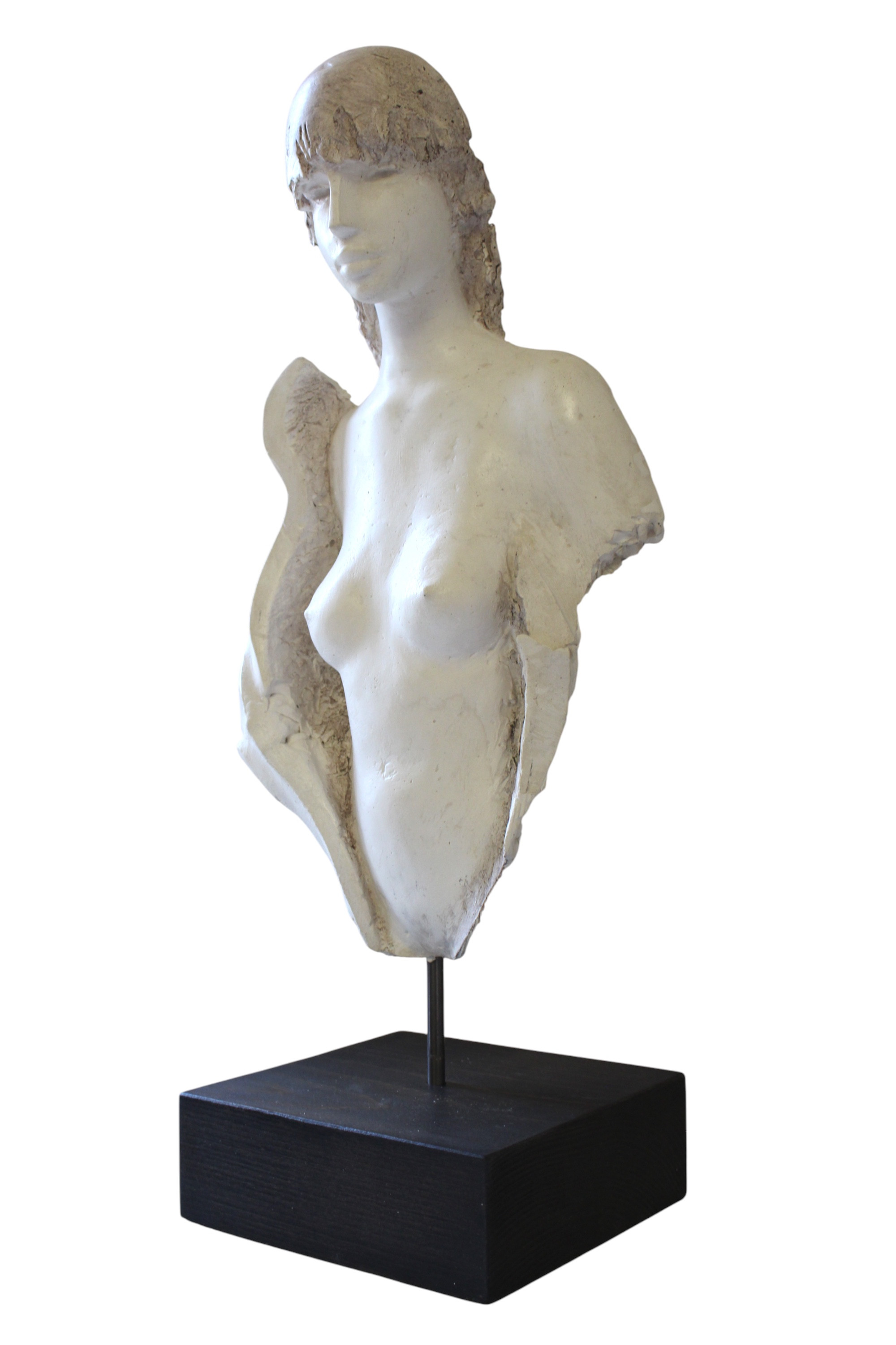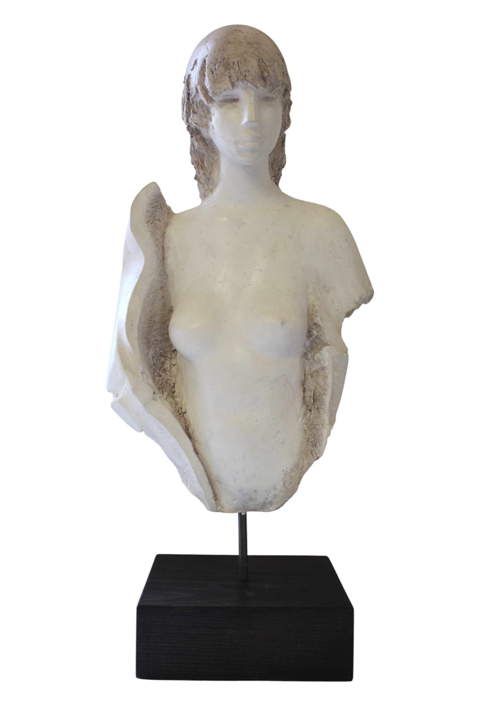 In questa scultura in resina, Giorgio Conta raffigura una figura femminile dalla presenza delicata e silenziosa, sospesa tra naturalismo e astrazione. Il volto, morbido e raccolto, emerge con una calma introspettiva, mentre il corpo è definito da superfici irregolari e aperture laterali che lasciano affiorare la materia, creando un dialogo tra concretezza e immaginazione.