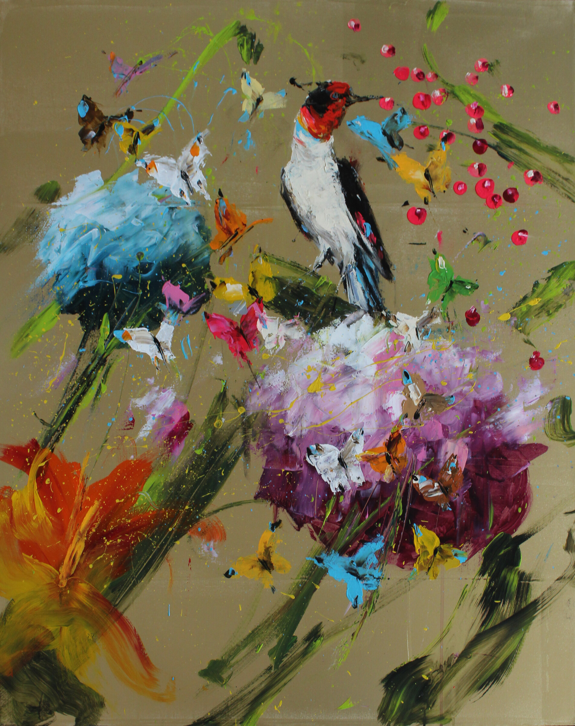 Un turbinio di fiori, farfalle e bagliori colore oro si anima attorno a un piccolo uccello, protagonista silenzioso di una scena che sembra colta nel suo istante più vibrante. Le pennellate di Luca Bellandi, rapide e istintive, intrecciano toni accesi – dall’azzurro al magenta, dall’arancio al lime – in una composizione che vibra di spontaneità. Le bacche rosse punteggiano lo sfondo come note luminose, mentre gli schizzi gestuali amplificano la sensazione di movimento. Un’opera fresca e dinamica, dove natura e colore si fondono in un incontro sorprendente e immediato.