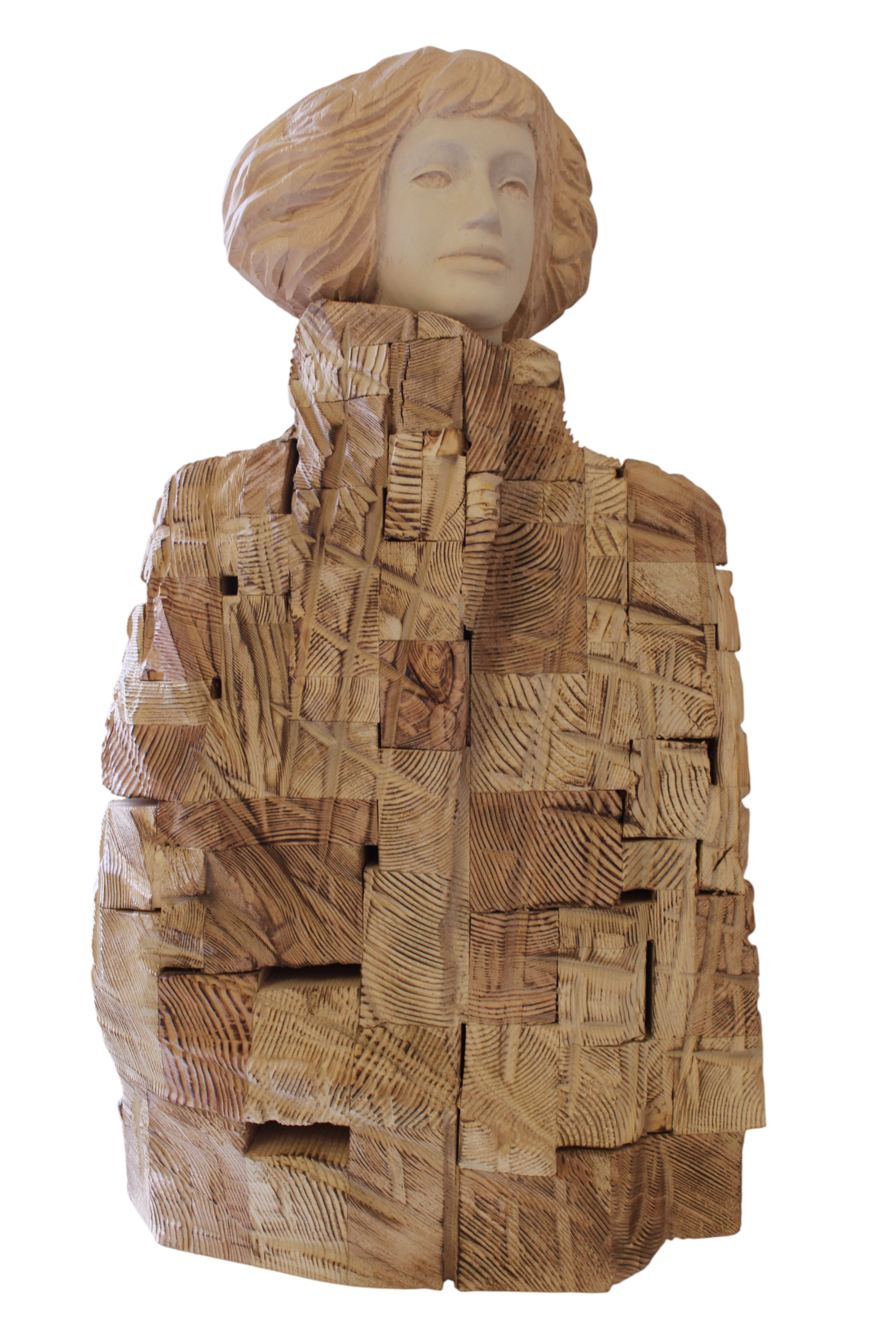 La superficie, scandita da blocchi lignei incisi e orientati in direzioni diverse, richiama i ritmi della natura e le stratificazioni del tempo. La figura non appare frammentata, ma costruita, come un organismo che prende forma attraverso l’equilibrio delle sue parti.