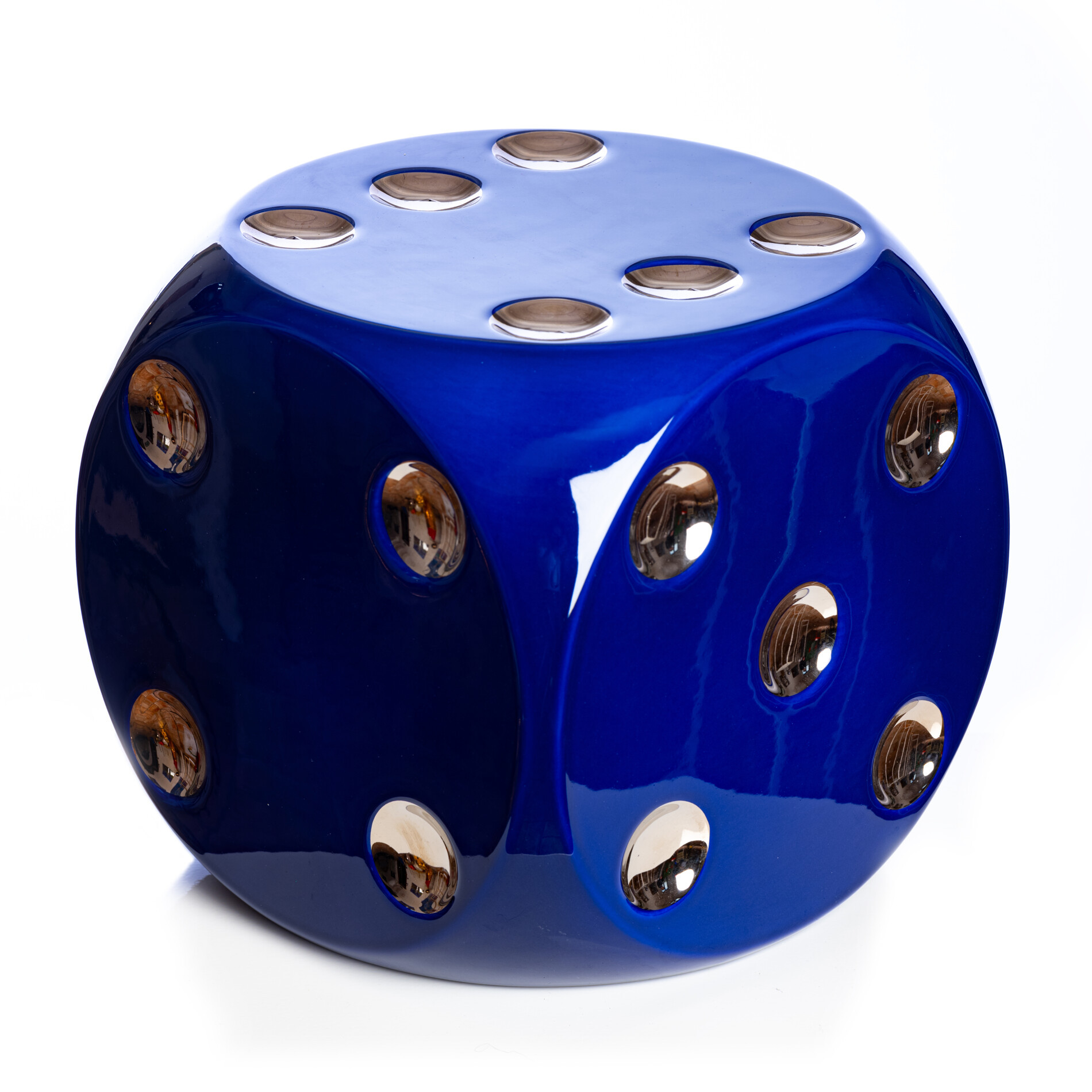 La vita è un gioco: e questo cubo in ceramica smaltata blu e inserti in oro zecchino firmato Giorgio Laveri gioca con il concetto di illusione e realtà. Le superfici lisce e i bordi definiti creano un contrasto tra semplicità e complessità, invitando alla riflessione.