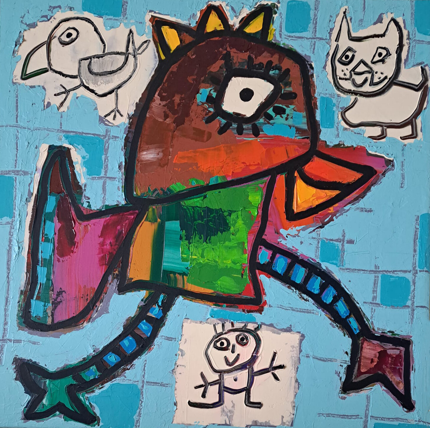 Un piccolo uccellino si trova al centro di un vorticoso girotondo di animali, immerso in un universo azzurro vibrante e sognante. Le tonalità luminose e le pennellate materiche donano all'opera un senso di leggerezza e movimento, evocando la gioia spontanea del gioco. Il mondo di Asveri prende vita attraverso forme stilizzate e colori vivaci, trasmettendo un’emozione pura e istintiva, capace di riportare alla spensieratezza dell’infanzia.