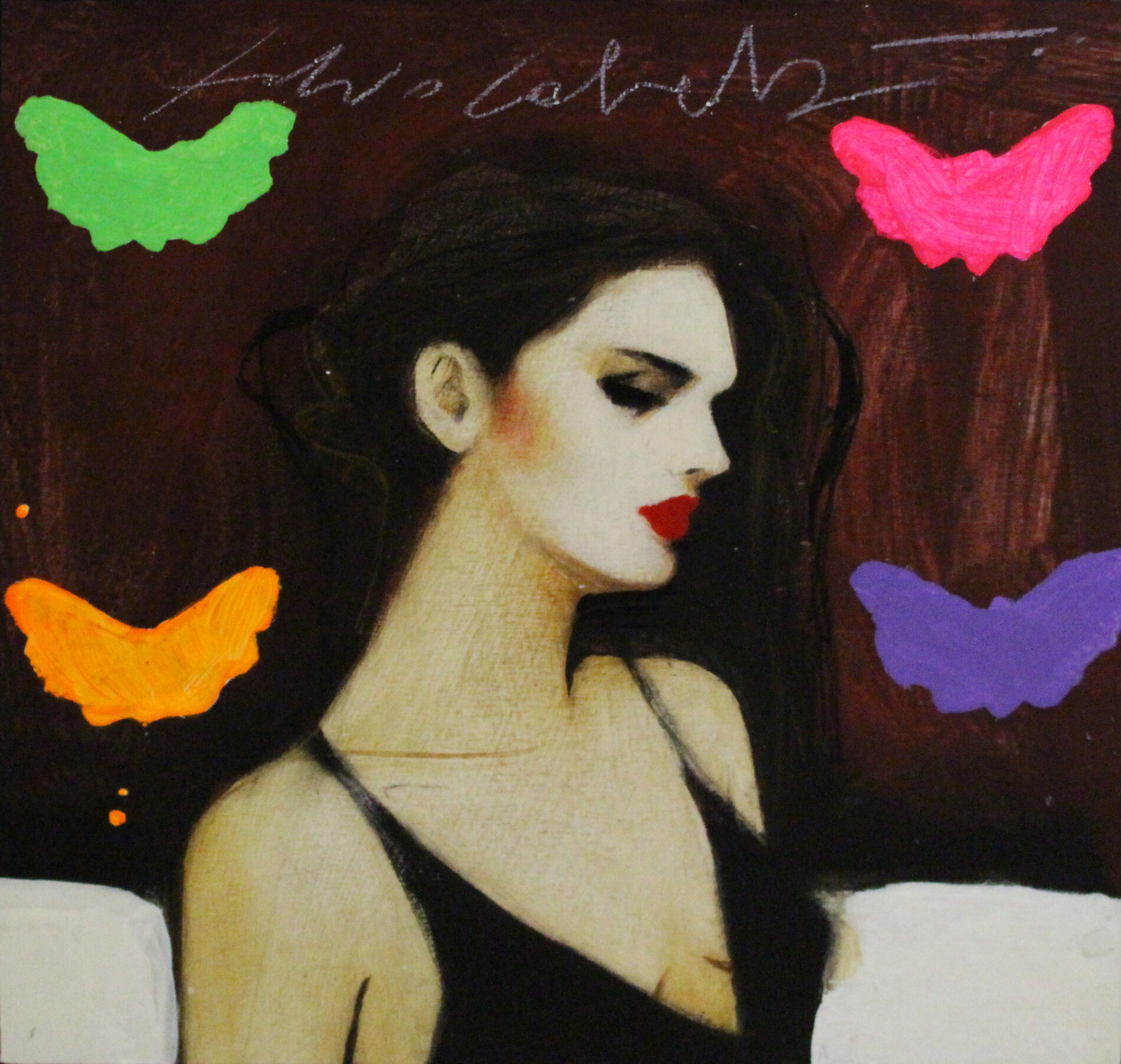 Un volto di donna emerge dal buio con eleganza sospesa, circondato da farfalle luminose che fluttuano come pensieri silenziosi. Il contrasto tra il nero profondo dello sfondo e i colori vibranti delle ali crea un’atmosfera onirica e intensa. Fabio Calvetti, maestro dell’introspezione pittorica, utilizza il colore a velature per conferire morbidezza e mistero, mentre il rosso acceso delle labbra è un punto di luce che cattura lo sguardo. Un’opera che celebra il silenzio e la bellezza della riflessione interiore.