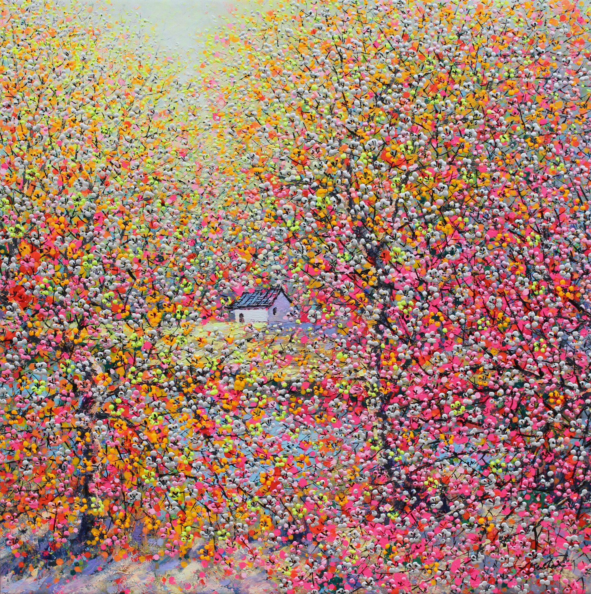 In questa nuova opera della serie Meditation, Je Shen avvolge lo spettatore in un’esplosione di colore che trasforma il paesaggio in un luogo quasi fiabesco. L’artista utilizza ancora una volta la sua caratteristica tecnica puntiforme per creare una fitta trama di fiori e foglie, un intreccio vibrante di rosa, aranci, gialli e verdi che pulsa di energia luminosa. Tra i due grandi alberi in piena fioritura, Je Shen lascia emergere una piccola casa isolata, simbolo di quiete e rifugio interiore. Questo elemento, apparentemente semplice, diventa il cuore silenzioso dell’opera: un invito alla calma e alla contemplazione all’interno di un mondo intenso e brulicante di vita.