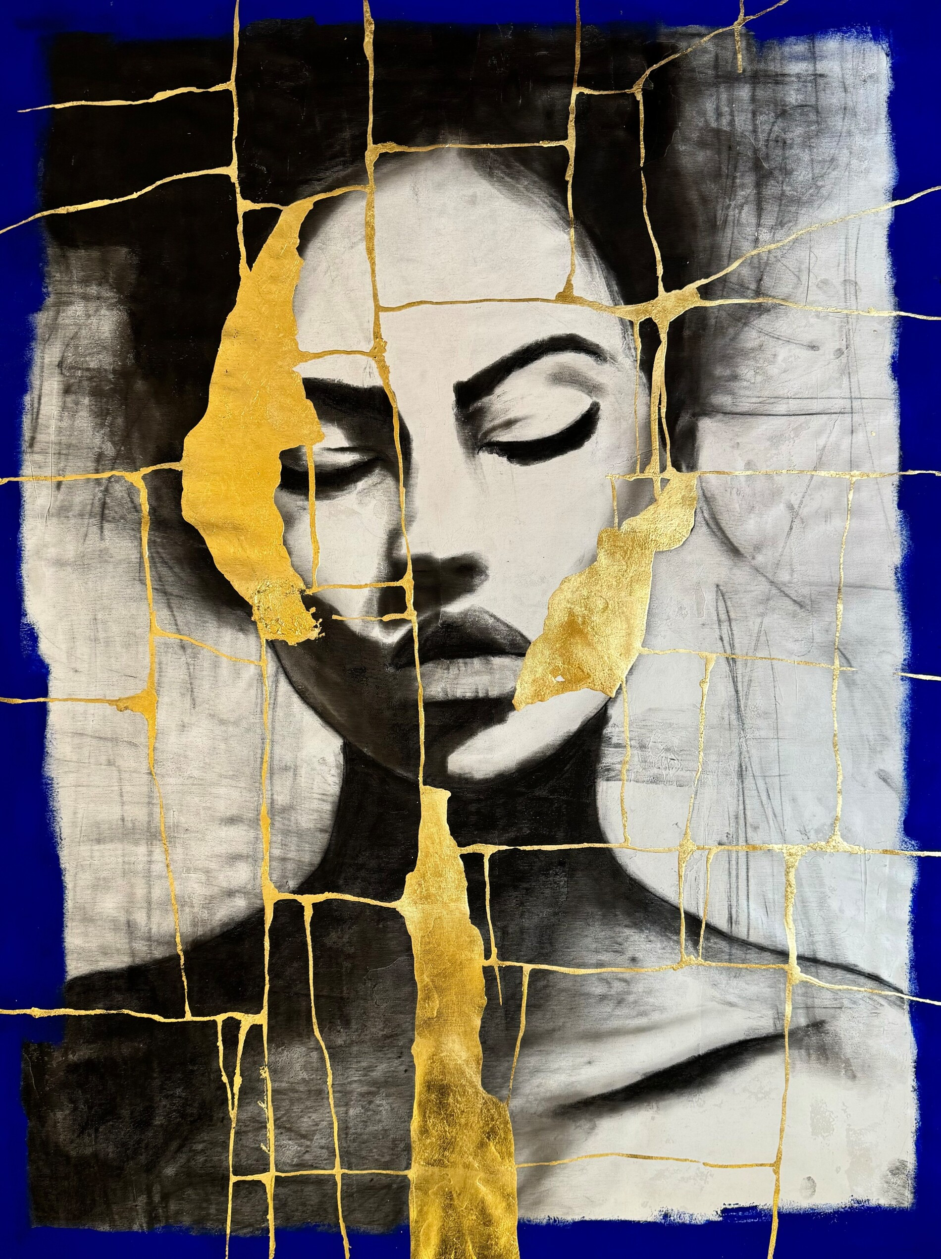 Un volto emerge come un respiro trattenuto: gli occhi chiusi, la luce che sfiora la pelle, il silenzio che diventa forma. Il ritratto, costruito in scale di grigio profondissime, sembra sul punto di dissolversi se non fosse per le fratture dorate che lo attraversano. Come vene luminose, la foglia d’oro ricompone ciò che è stato spezzato, trasformando la fragilità in struttura portante.