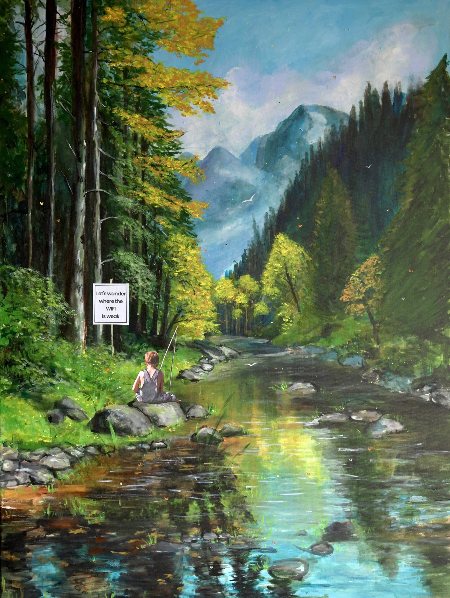Un bambino sospeso tra due palme, pronto a tuffarsi in un mare onirico: alla luce naturale, l’immagine evoca libertà e spensieratezza. Ma è nei livelli successivi che la scena cambia volto. I dettagli UV rivelano piccoli segreti, frasi e simboli nascosti tra le onde; al buio, tutto si anima come un ricordo rallentato, immerso in un’atmosfera ovattata e quasi magica. Un’opera che parla di tempo interiore, memoria e desiderio di volare.
