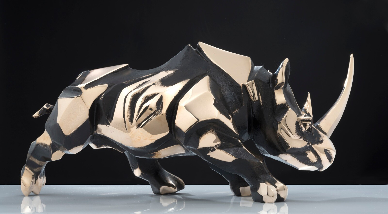 Deep Impact – Nero Xtreme Small è un bronzo laccato nero tagliato in forme squadrate e austere. L’assetto possente del rinoceronte emerge dalla materia oscura con un linguaggio visivo calibrato tra astratto e figurativo. Ogni dettaglio atomizzato coopera a suggerire solidità, forza tectonica e tensione silente.
