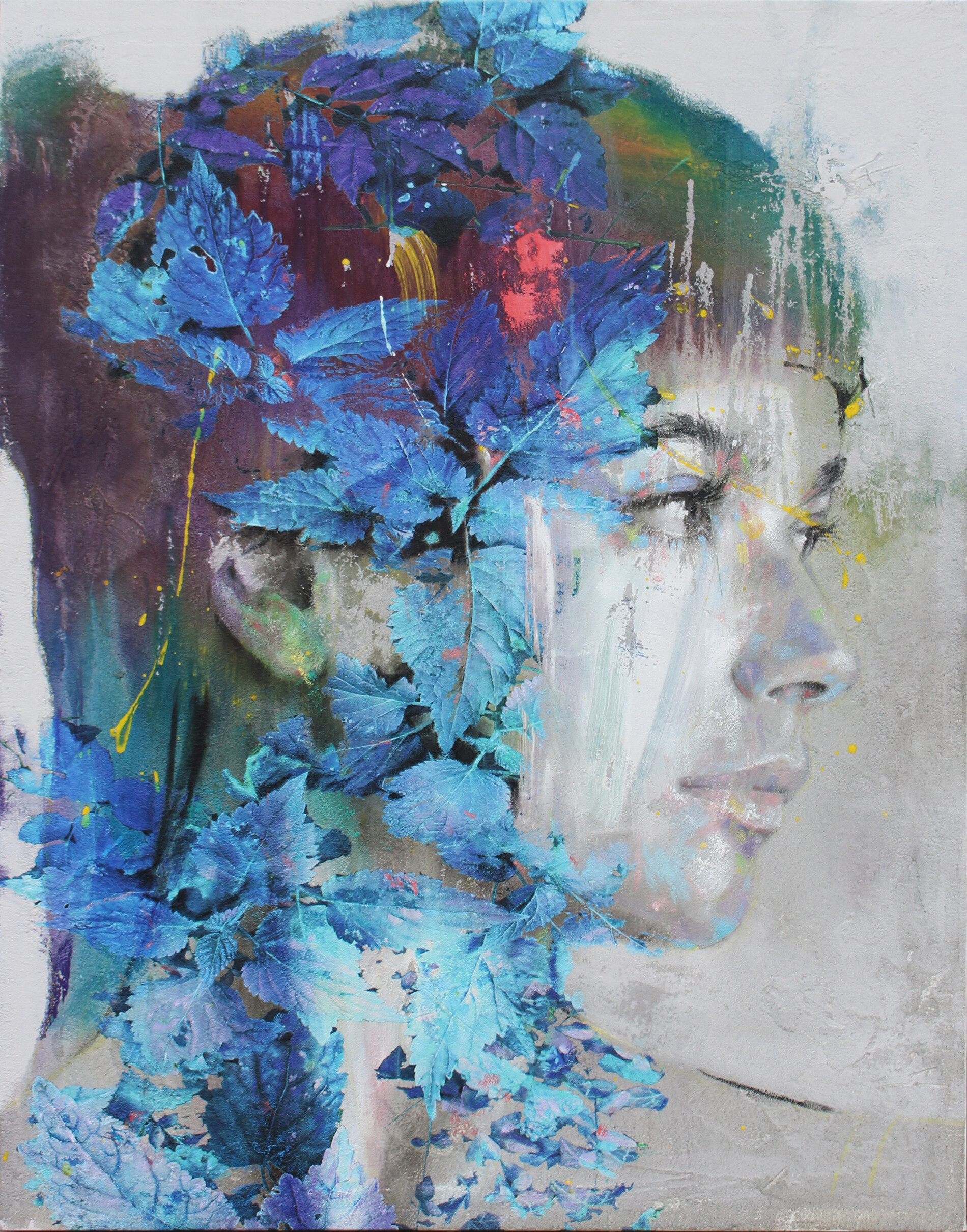 In quest'opera di Pier Toffoletti, il volto di una donna si fa protagonista. Adornata da un "copricapo" di foglie dai freddi del blu e dell'azzurro ghiaccio - la figura sfuma in un legame profondo con la natura. Le foglie, che avvolgono la testa della donna, sembrano respirare insieme a lei, conferendo all'opera un'aura di mistero e bellezza effimera, dove l’elemento umano e quello naturale si fondono in perfetta armonia.