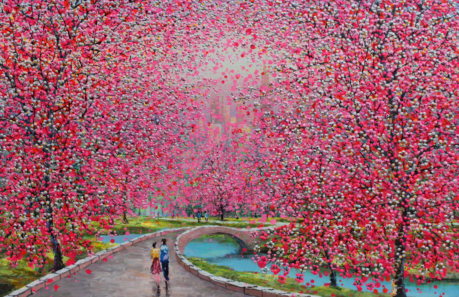 In questo incantevole dipinto, Je Shen conduce lo spettatore in un viale di delicate fioriture rosa, dove la luce filtra tra gli alberi creando un’atmosfera di quiete e poesia. Al centro della scena, una coppia cammina immersa in questo paesaggio sospeso, simbolo di armonia e contemplazione. Con la sua caratteristica trama pittorica e l’uso immersivo del colore, Je Shen converte il dato naturale in una dimensione emotiva, dove il paesaggio si fa esperienza interiore.
