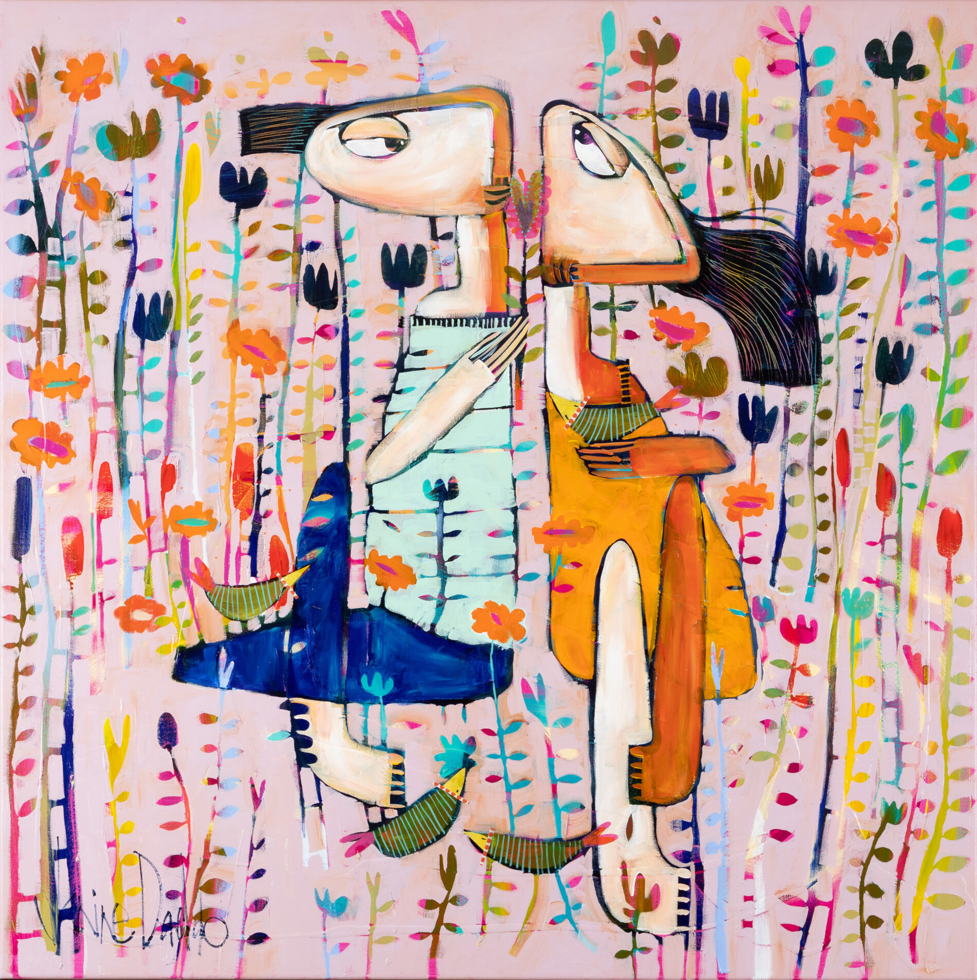 In questo dipinto di medie dimensioni di Janine Daddo, un prato fiorito fa da sfondo alle tenere effusioni di due innamorati. La tecnica è mista su tela e la palette cromatica scelta è delicatissima ma allo stesso tempo vivace e vibrante, il colore prevalente è il rosa delicato dello sfondo, a cui si sovrappongono una miriade di fiori colorati.