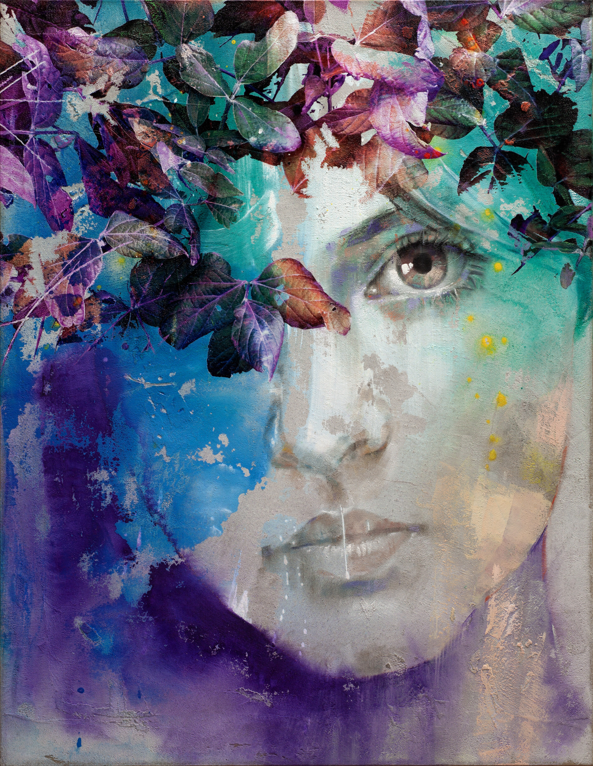 In quest’opera Pier Toffoletti conferma la sua ricerca sul volto come luogo di memoria e trasformazione. La protagonista emerge da una superficie stratificata, dove pittura e interventi gestuali si intrecciano in un equilibrio poetico. I toni viola e azzurri, attraversati da elementi naturali e colature leggere, costruiscono un’immagine sospesa, intima e contemporanea. Lo sguardo, parzialmente velato, diventa il punto di contatto tra identità e immaginazione, cifra distintiva del linguaggio dell’artista.