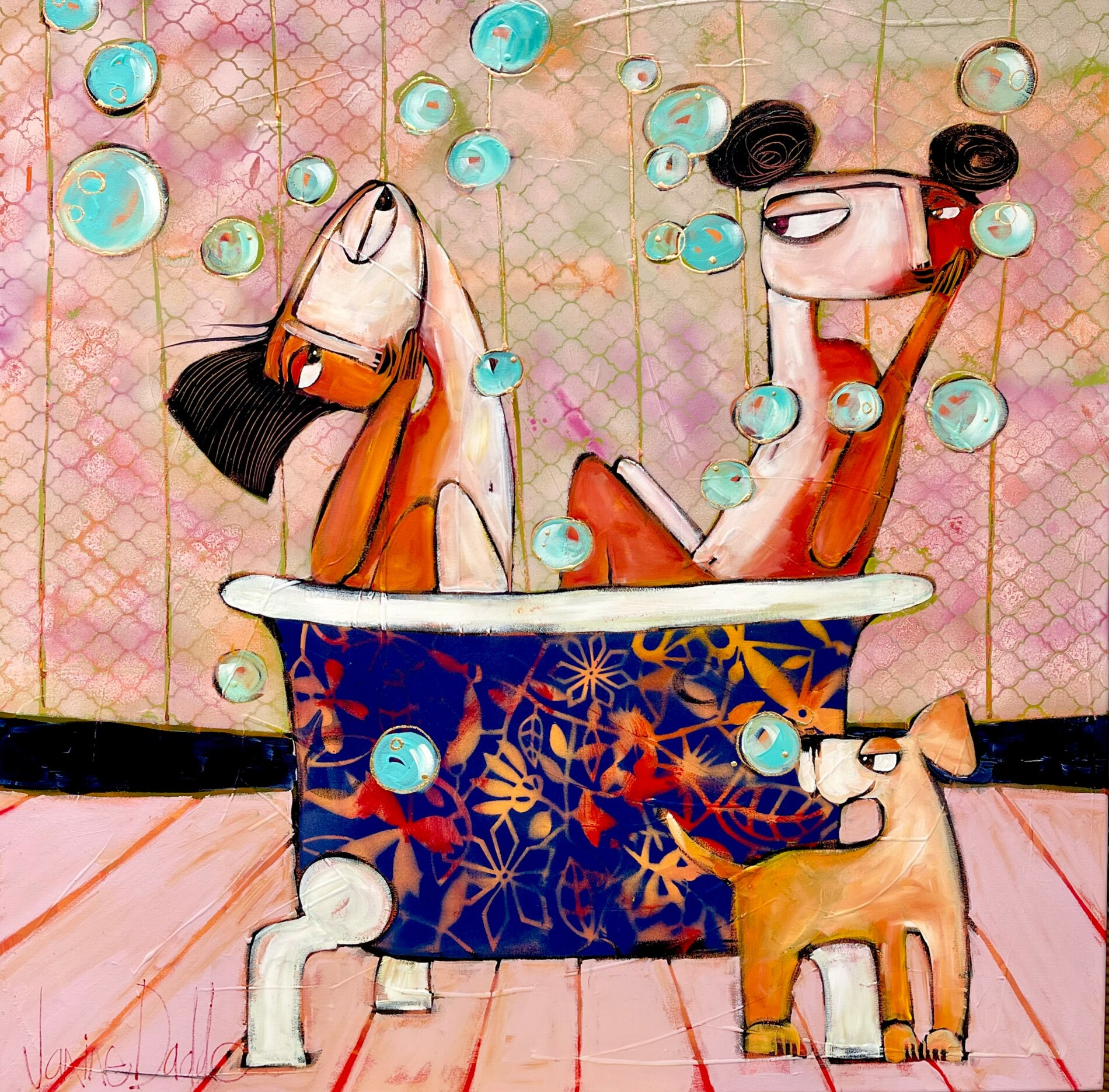 In quest’opera a tecnica mista su tela i tre protagonisti condividono un momento intimo e leggero, immersi in una vasca colma di bolle che volano nell’aria. Gli sguardi sono carichi di complicità, e intorno tutto sembra rallentare. Una composizione che racconta la dolcezza dello stare insieme, di quei piccoli attimi di intimità che trasformano la quotidianità in qualcosa di speciale.